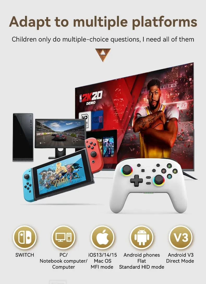 1. 컨트롤러는 스위치 콘솔, PC, TV, Android ShotingPlusV3 모드, HID 표준 모드 및 다양한 게임을 지원합니다. IOS, 휴대 전화, MFI 게임 및 /PS4 콘솔.