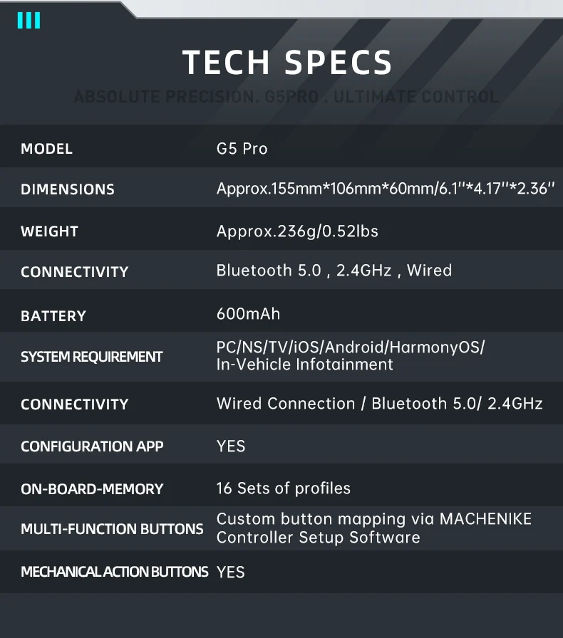 G5 Pro 독점 소프트웨어를 사용하여 자신 만의 매크로를 만들면 최대 32 히트 콤보 동작을 쉽게 실행하여 상대방보다 우위를 점할 수 있습니다.