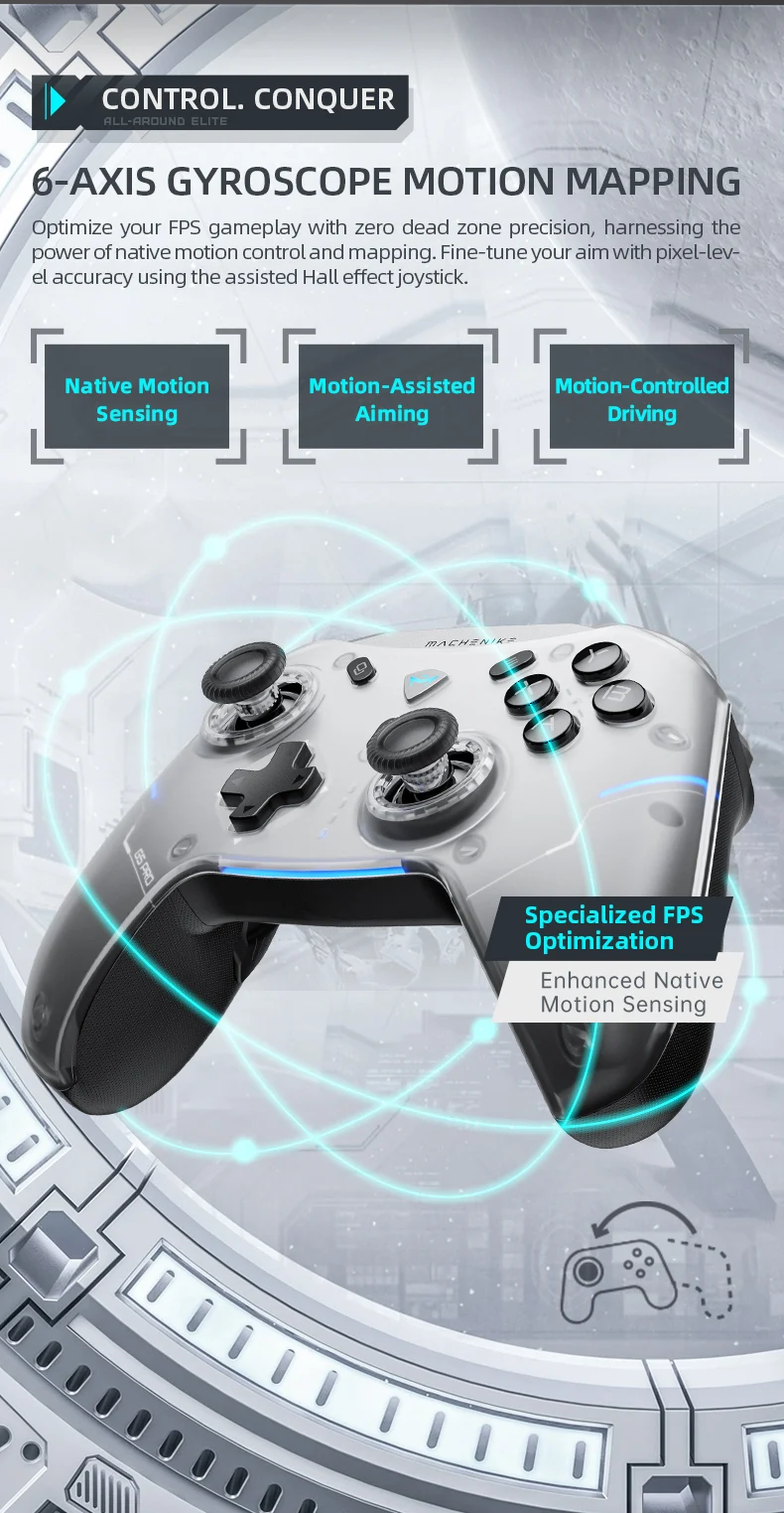 기본 모션 제어 및 매핑의 힘을 활용하여 데드 존 정밀도가없는 FPS 게임 플레이를 최적화하십시오. 보조 홀 효과 조이스틱을 사용하여 픽셀 수준의 정확도로 조준을 미세 조정하십시오.