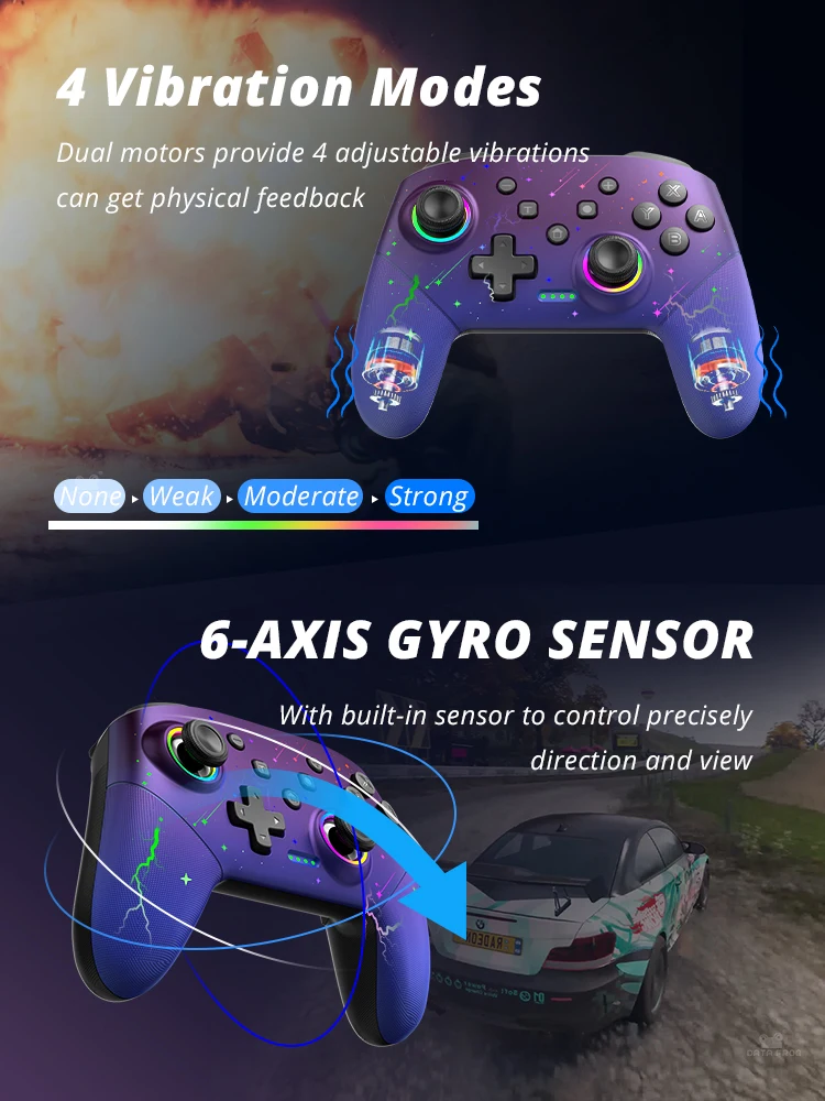 닌텐도 스위치 용 컨트롤러에는 약한, 중간 및 강한 3 단계 정밀한 진동을 가진 이중 진동 모터가 있으며 게임 몰입도를 높이기 위해 우수한 진동 피드백을 제공합니다. 6 축 자이로 센서를 통해이 컨트롤러는 컨트롤러의 기울기를 감지하고 빠른 응답을 할 수 있으며 모션 감지 게임을하는 동안 더 재미있게 즐길 수 있습니다.