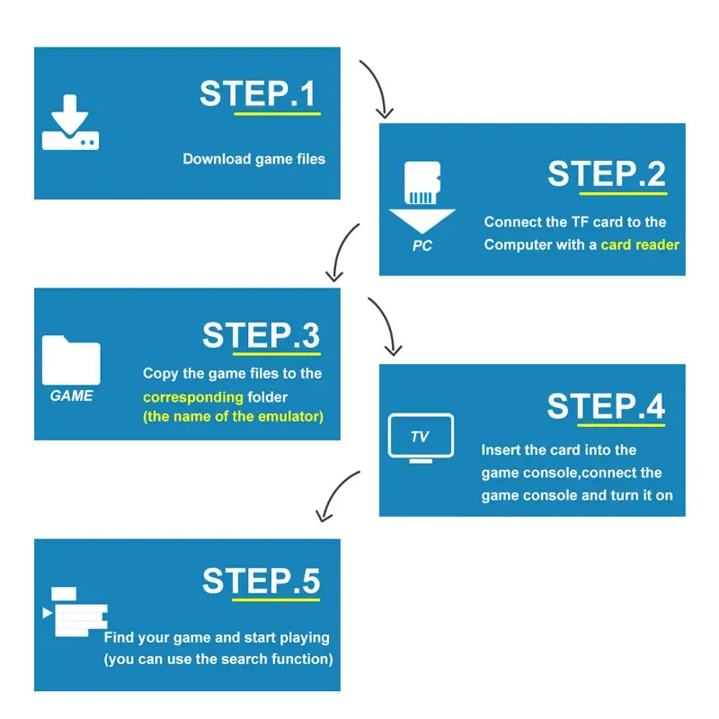 업그레이드 된 RK3128 CPU 칩을 갖춘 콘솔에는 PS1, MD, SFC, FC, ATARI , GBA, GBC, GB , CPS 형식 게임과 호환되는 9 개 이상의 에뮬레이터가 내장되어 있습니다. 메모리 카드에서 다운로드하여 저장할 수 있습니다.