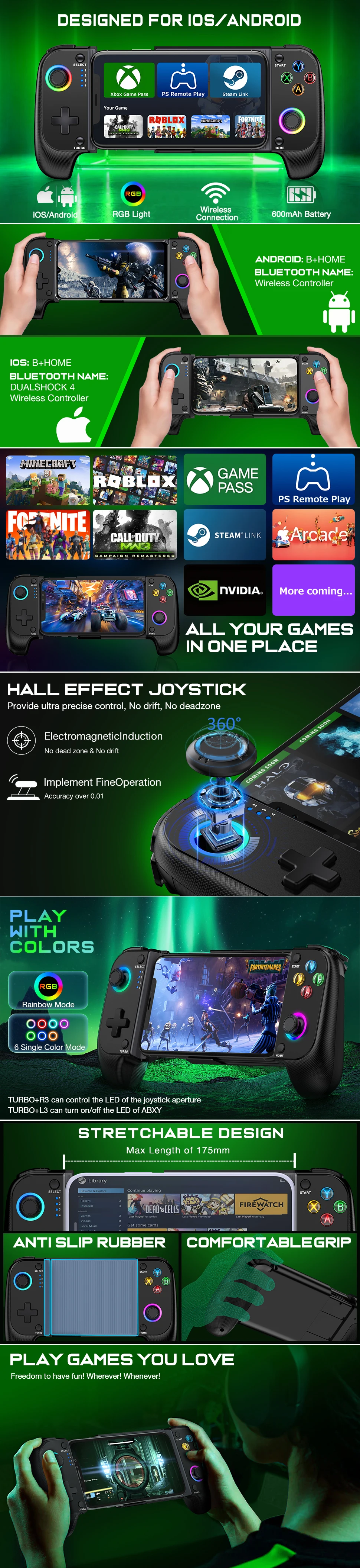 블루투스 컨트롤러 STK-7009FX, 홀 스틱 3D, RGB 조명 효과 디스플레이를 사용하여, 주요 기능은 안드로이드 플랫폼/IOS 플랫폼 모바일 게임 컨트롤러에 사용됩니다. XBOX 클라우드 플랫폼, 콘솔 스트리밍 게임 플레이를 지원합니다. Shanwan 컨트롤러, 게임 패드 공간 및 슈팅 플러스 v3 + APP를 지원합니다.