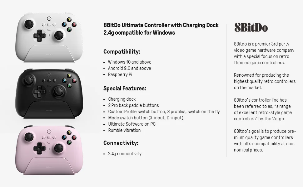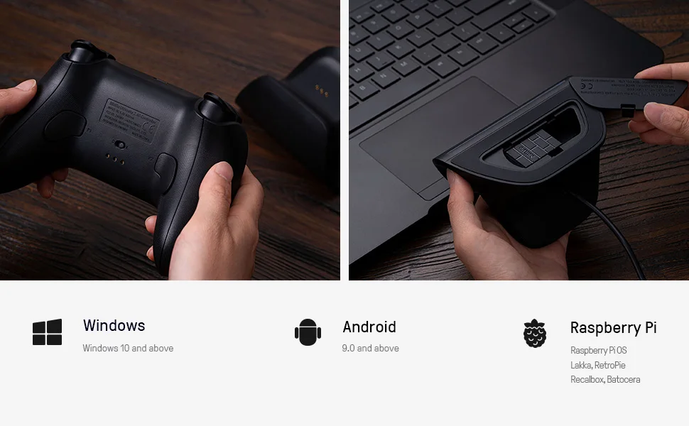 창문. 안드로이드. 라즈베리 파이. 8BitDo 컨트롤러는 각 최신 장치에서 가능한 한 다용도로 설계되었습니다. 이제 양방향 모드 스위치를 사용하여 2.4g 연결을 통해 컨트롤러를 즉시 페어링할 수 있습니다.
