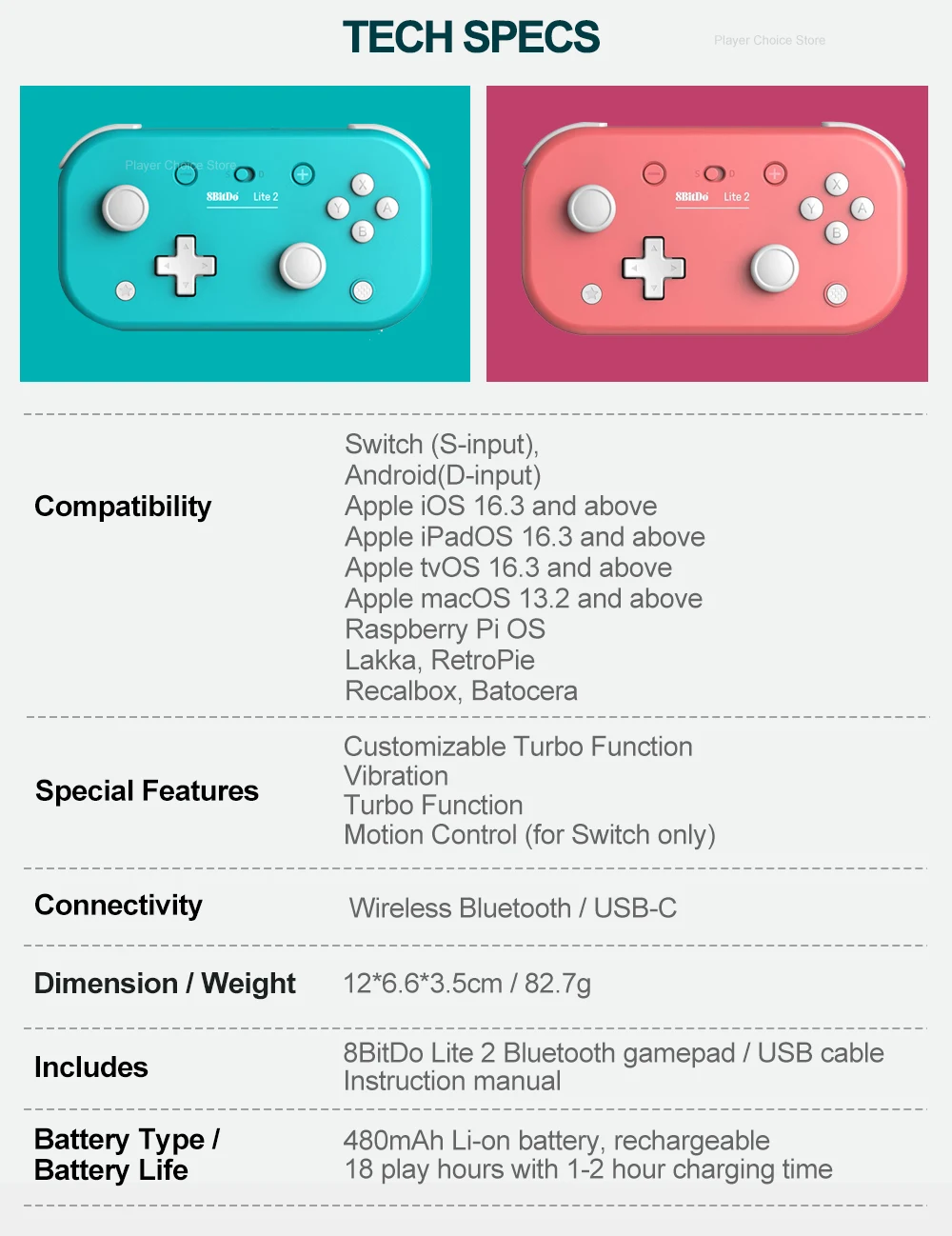 스위치/안드로이드/애플/라즈베리 파이와 호환되는 라이트 2 블루투스 컨트롤러