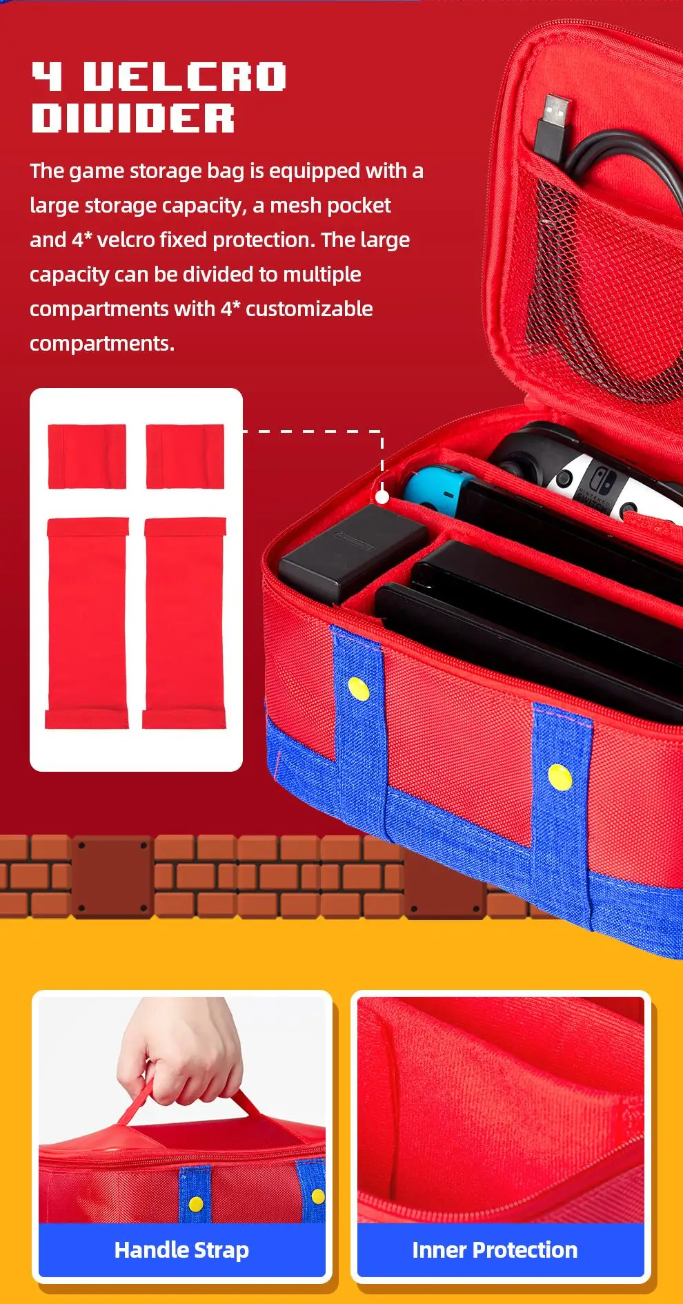 1. 이 여행용 스위치 케이스에는 튼튼한 스트랩이 함께 제공되어 여행 중이거나 매일 사용할 때 Nintendo Switch와 호환되는 것을 안전하게 보관할 수 있습니다.
