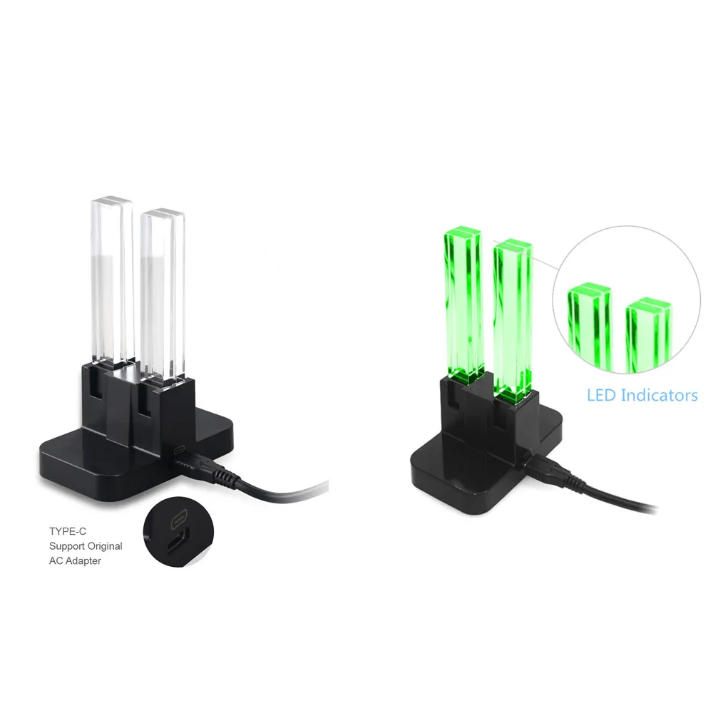 간단한 작동 디자인-쉬운 슬라이드 인 디자인 및 플러그 앤 플레이. JoyCons를 충전 도크에 넣고 USB 포트에 연결하면 충전됩니다. 개별 LED 가로등 기둥은 JoyCon의 충전 레벨을 나타냅니다. 매우 편리합니다.