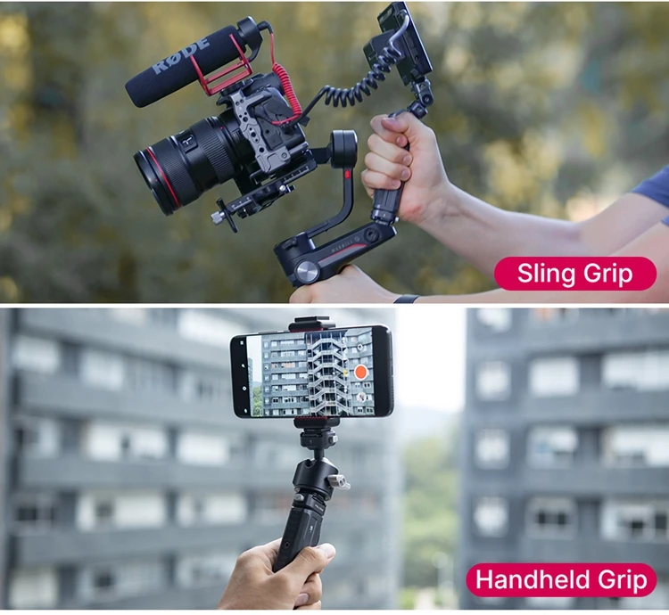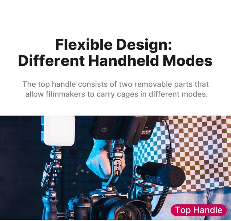상단 손잡이는 영화 제작자가 다른 모드로 케이지를 운반 할 수있는 두 개의 착탈식 부품으로 구성됩니다.