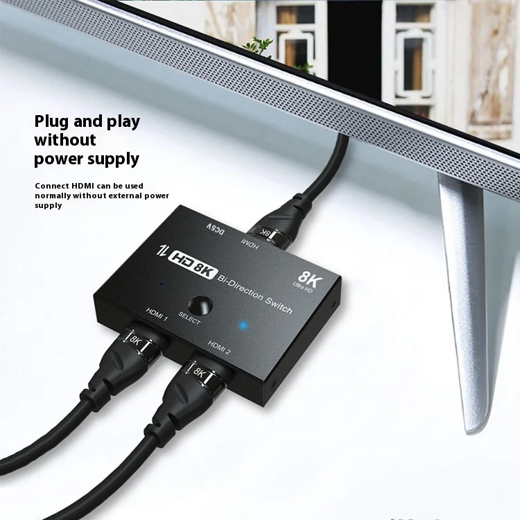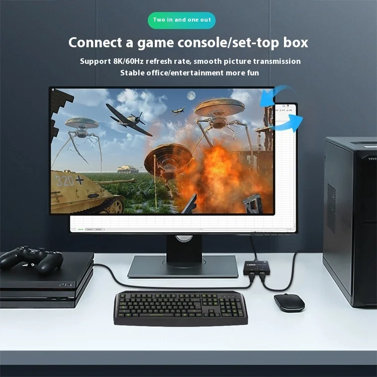 양방향으로 사용할 수 있으며 두 대의 컴퓨터 호스트가 하나의 모니터를 연결하거나 한 대의 컴퓨터 호스트가 두 대의 모니터에 연결하는 데 사용할 수 있습니다.