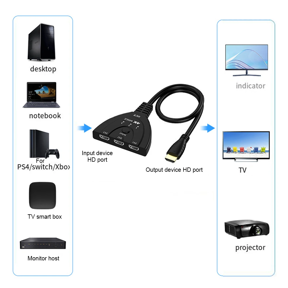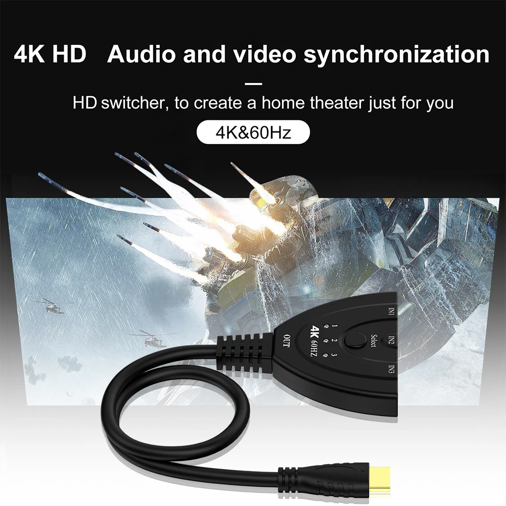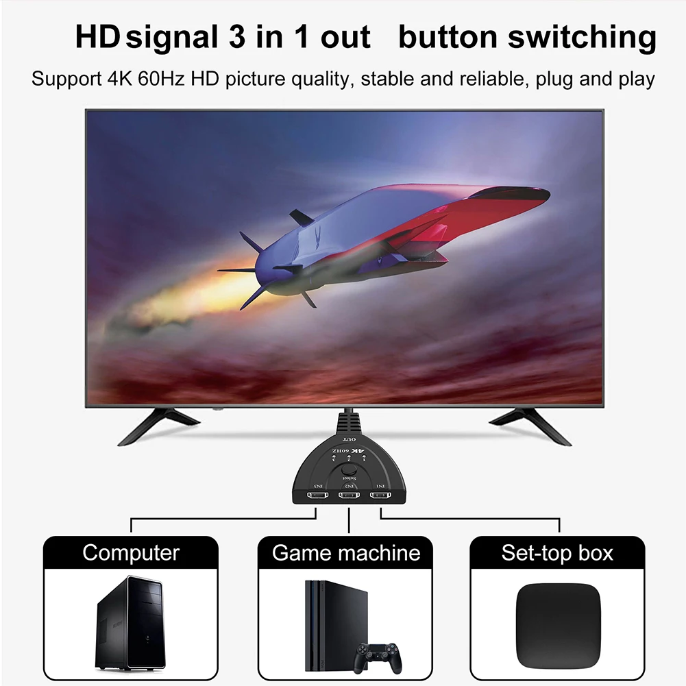 4K HDMI 호환 스위처 선택기 3 in 1 out HDMI 호환 스플리터 허브 스위처 멀티 HDMI 호환 어댑터 화재 스틱 HDTV /4 Xbox 360 호환 특징: 2. 수동 전환: T그는 3 포트HDMI 호환전환기 선택기는 신호를 쉽게 전환할 수 있도록 대형 버튼이 특징입니다. 스위치 버튼을 눌러 신호를 1 초 이내에 변경하여HDMI 호환플러그를 뽑는 번거 로움없이 장치. 3. 4K 울트라 HD 해상도:60Hz 에서 HDTV 4K (3840x2160P) 를 지원하여 멋진 영상을 즐길 수 있습니다. 이HDMI 호환허브는 또한 3D 디스플레이를 지원하여 선명한 오디오 및 비디오로 영화 경험을 제공합니다.왜곡이나 지연없이. 4. 플러그 앤 플레이 편의:이HDMI 호환스플리터 허브 스위처는 설치 및 사용이 매우 간편하여 무역 박람회, 회의실, 기숙사, 거실, 주방 및 뒷마당에 적합합니다. 금도금 커넥터는 우수한 신호 전송과 내구성을 보장합니다. 5. 전원 필요 없음: D번거롭지 않은 작업을 위해 설계된 이HDMI 호환스위치에는 추가 드라이버 나 전원 공급 장치가 필요하지 않습니다. 장치를 연결하고 미디어에 즉시 액세스하여 매번 부드럽고 즐거운 경험을 보장하십시오. 사양: 원산지: 중국 본토 제품 크기: 91.50x83.00x16.00mm 제품 크기: 3.6x3.27x0.63inch 색상: 블랙 쉘: ABS 플라스틱 인터페이스: HDMI 호환 표준 인터페이스 해상도: 4K60HZ HD, 이전 버전 호환 비디오 전송 대역폭: 600MHz/18Gbps HDMI 호환 입력 케이블 길이: 10m AWG26 HDMI 호환 표준 케이블 HDMI 호환 가능한 출력 케이블 길이: 55cm AWG26 액세스 포트 수: 3 호환 장치: 프로젝터, 노트북, 게임 콘솔, 모니터, 개인용 컴퓨터, TV, DVD 플레이어, 캠코더, 카메라, 블루 레이 플레이어 참고 사항: 1. 두 모니터를 동시에 표시 할 수 없습니다. 2.HDMI-3 in 1 out과 호환되며 한 번에 하나만 선택할 수 있습니다. 반대로 사용할 수 없습니다. 1 대의 컴퓨터 입력과 3 대의 모니터 출력을 사용할 수 없습니다. 참고: ![]()