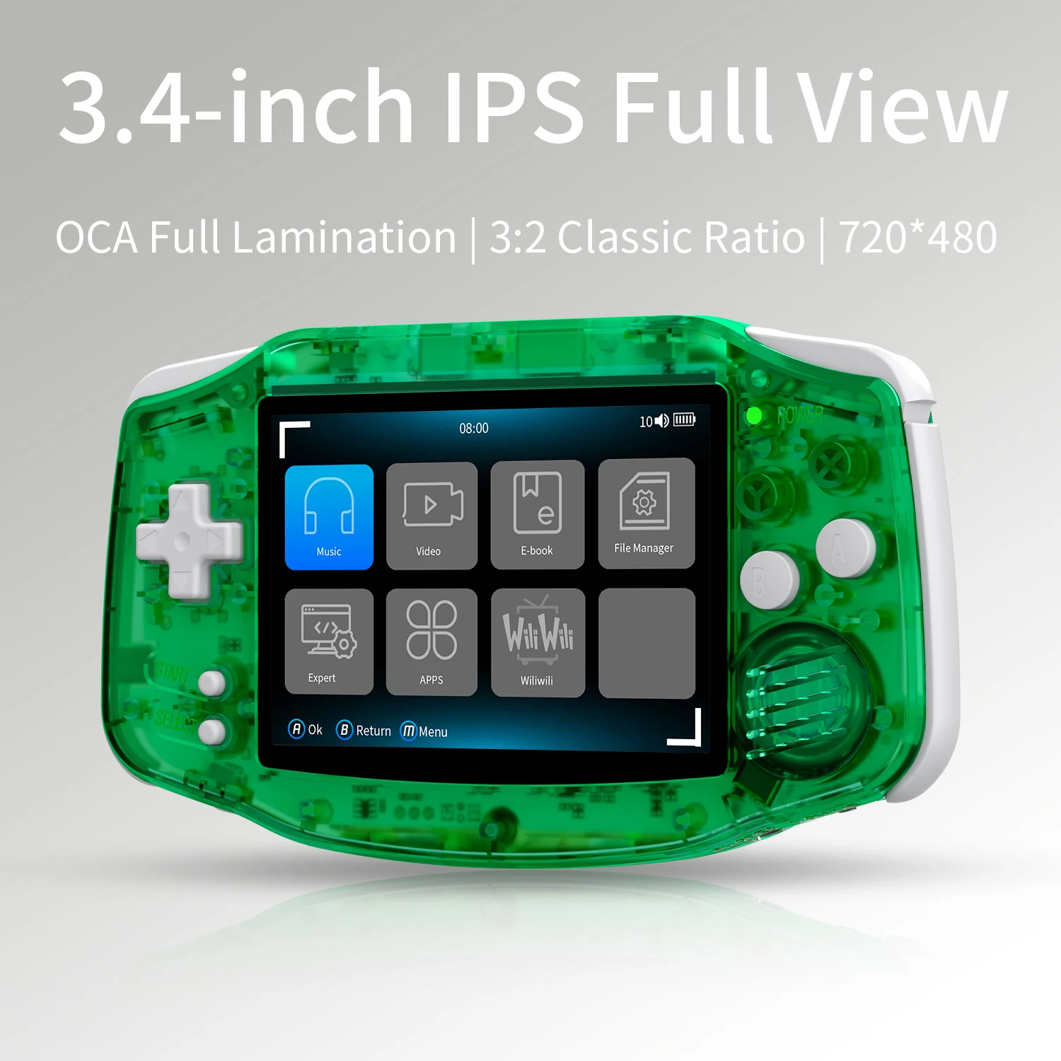 RG34XX 레트로 게임 콘솔 3.4 인치 IPS 전체 뷰 각도 화면 720*480 고해상도는 게임 콘솔 화면 세부 사항을 더 선명하게, 화면은 업그레이드 된 강화 유리를 사용, 견고한 보호, 내구성과 산산조각 저항 보장.