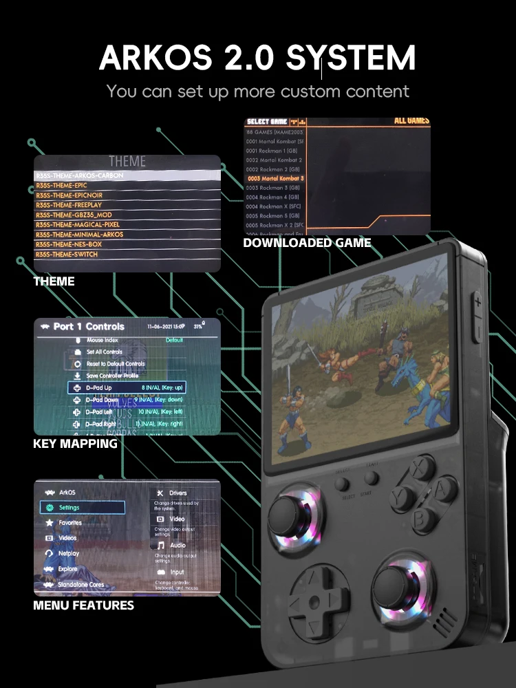 RG36 은 ARK OS에서 실행되므로 사용자는 게임 경험을 개인화하고 장치 성능을 최적화 할 수 있습니다. R35S 및 R36S 와 같은 다른 RK3266 장치와 완벽하게 호환되므로 원활한 통합과 일관된 경험을 보장합니다.