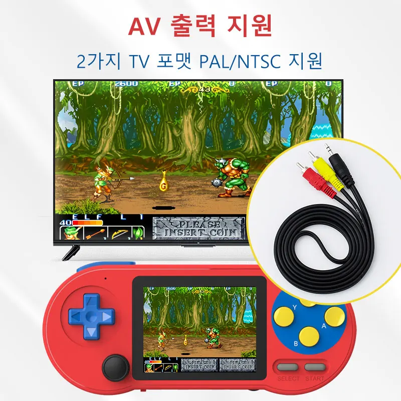 이 휴대용 콘솔은 AV 출력과 함께 제공되므로 TV에 연결할 수 있습니다. 더 큰 화면과 몰입 형 게임 경험을 즐기십시오. 향상된 영상과 사운드로 좋아하는 게임을 즐기십시오. 게임을 다음 단계로 끌어 올리는 완벽한 방법입니다.