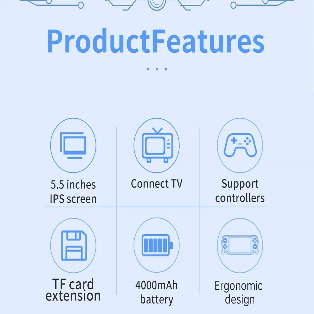 최고의 게임 콘솔 인 POWKIDDY X55 를 소개합니다! 5.5 인치 IPS RGB 화면과 1280*720 해상도로 다른 어떤 게임과도 같은 몰입 형 게임 경험을 즐길 수 있습니다. 쿼드 코어 RK3566 CPU 및 LPDDR4X 2GB RAM으로 구동되는이 콘솔은 고전적인 복고풍 게임을 즐기기에 적합합니다.