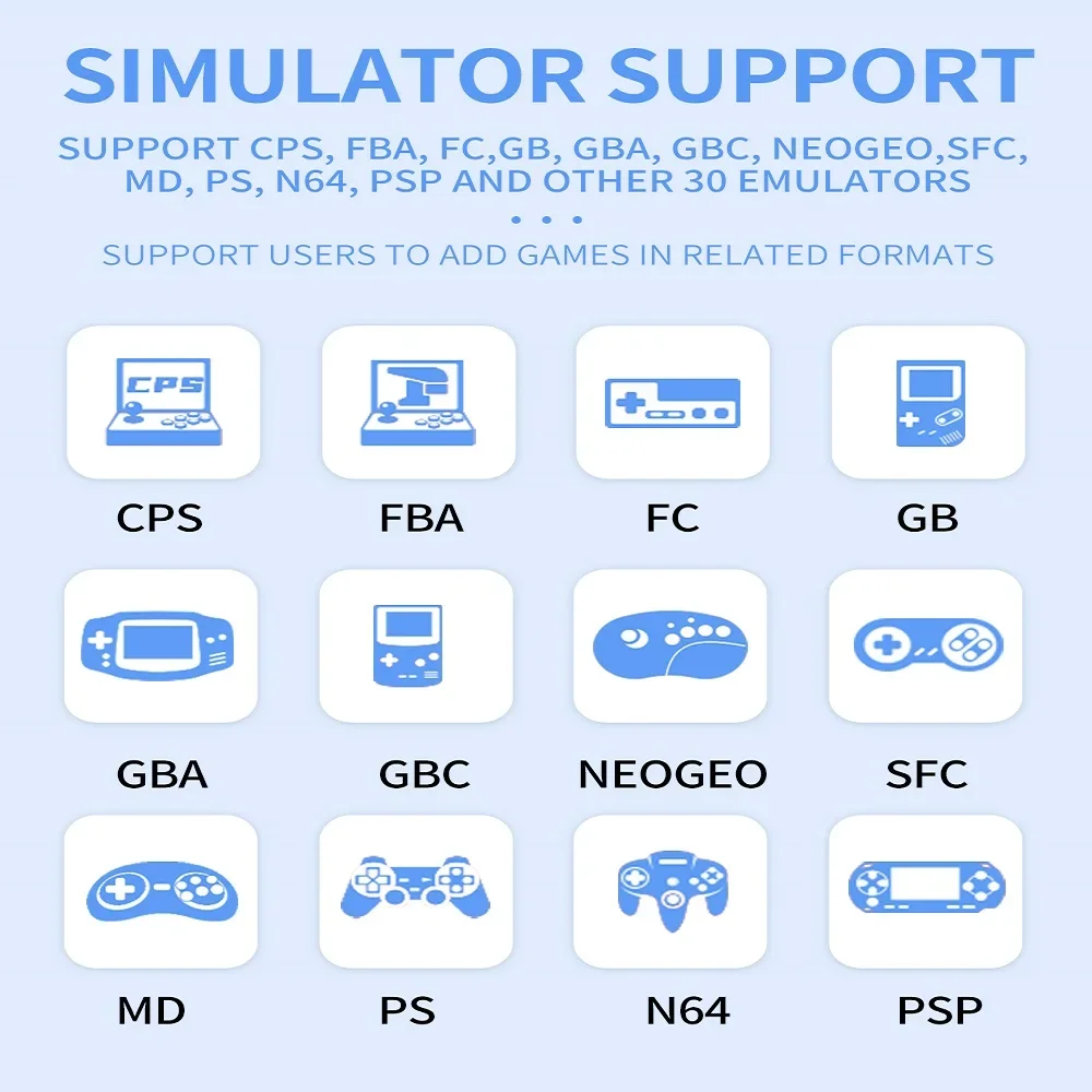 시뮬레이터 지원 FBA, FC,GB, GBA, GBC, 네오지오, SFC, MD, PS, N64, PSP 및 기타 30 개의 에뮬레이터 지원