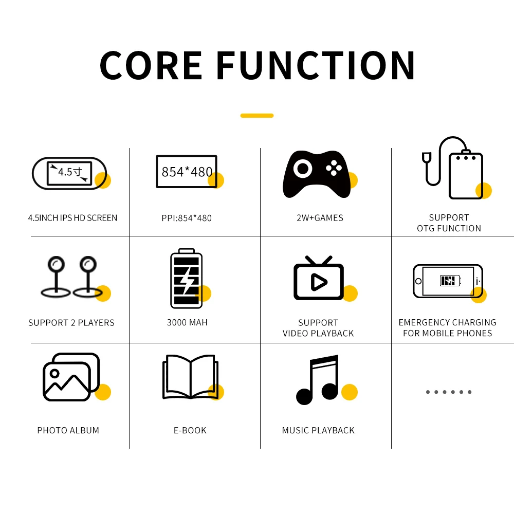 이 휴대용 게임 콘솔에는 20000 개 이상의 고전 게임에 내장 된 여러 핵심 기능이 있습니다. 고정밀 조이스틱이있는 IPS 고화질 부드러운 화면, 게임 다운로드 및 수집 지원, 14 가지 종류의 에뮬레이터 지원, 다양한 게임을 포괄합니다.