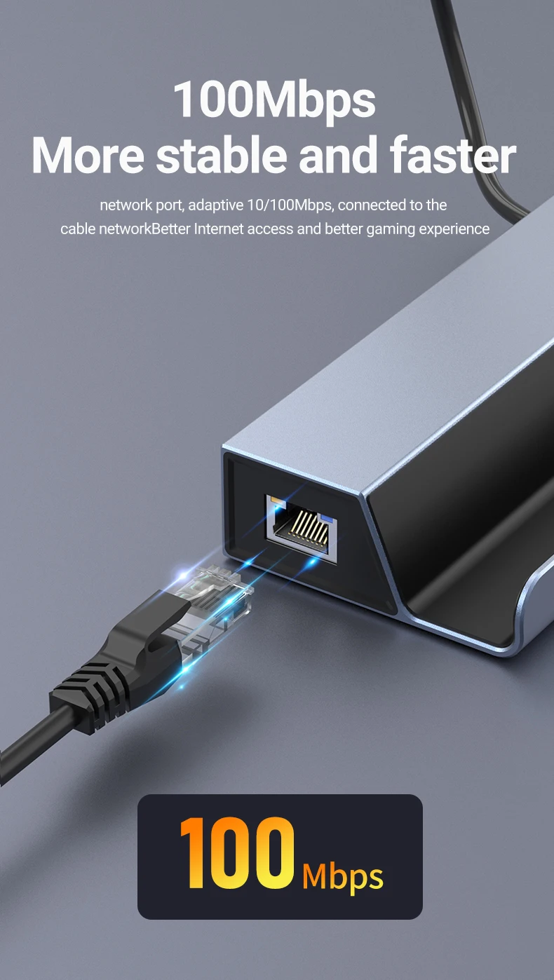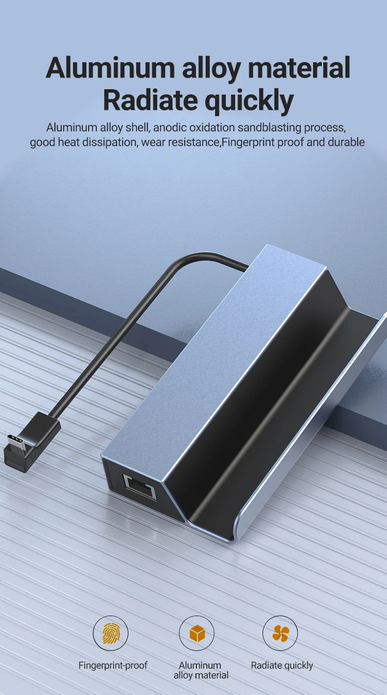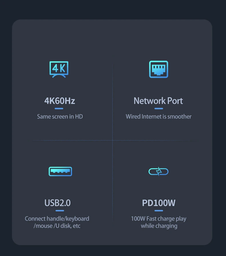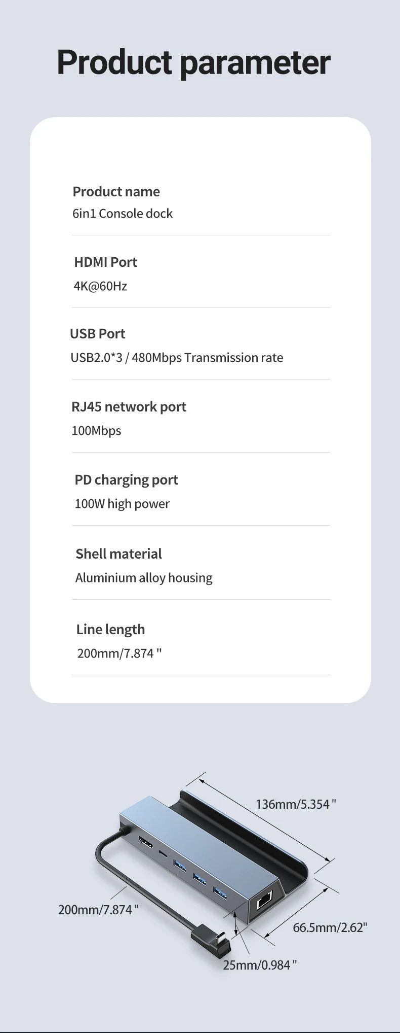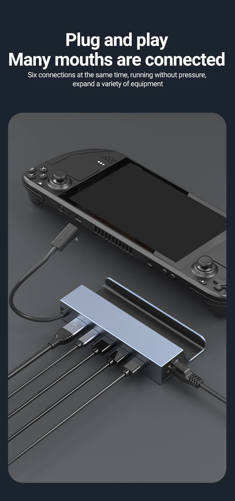 6 in 1 게임 허브는 게임 콘솔 지원 4K @ 60Hz HD 비디오 출력, PD 고속 충전 및 여러 USB 2.0 포트, RJ45 100M 인터페이스, 다양한 요구 사항 충족, 더 재미있게 즐기십시오.