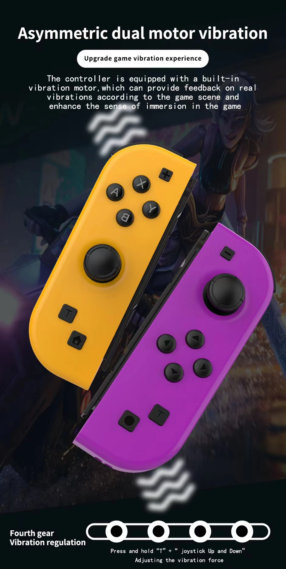 [특별한 경험] 새로운 디자인 버튼과 드리프트 걱정 없는 무선 Joy-c 컨트롤러, 독특한 인체공학적 디자인의 소재로 핸들이 잘 잡히기 쉽습니다. 동시에 6 축 자이로 스코프와 2 개의 진동 모터가 내장되어있어 게임을 몰입하게 경험하고 게임 패드를 공유 할 수 있습니다! 여러분은 친구들과 가족들과 즐거운 시간을 보낼 수 있습니다.