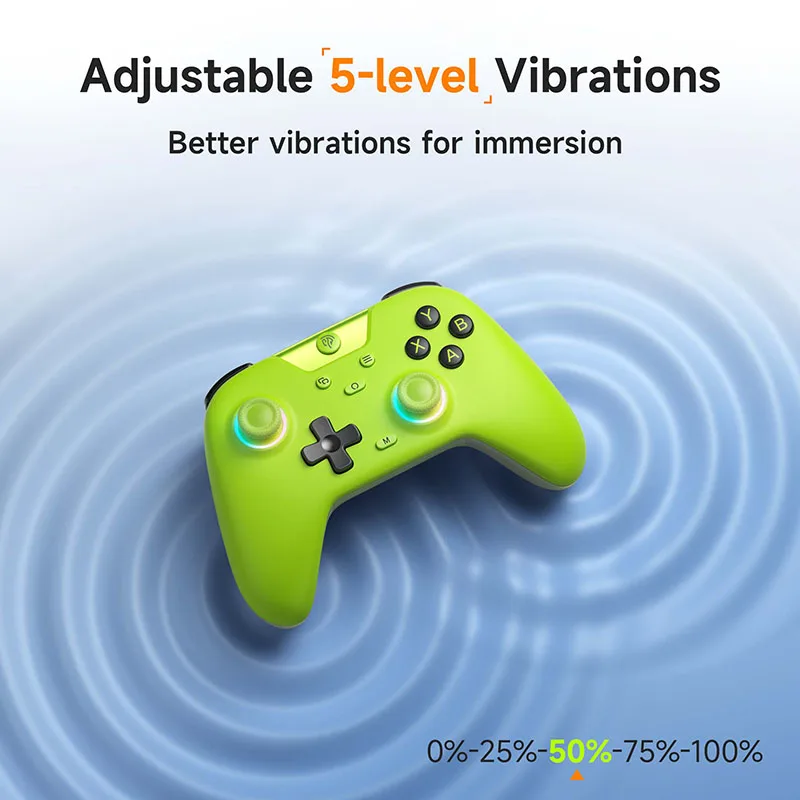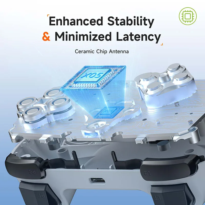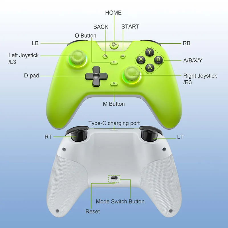 X05 컨트롤러는 2.4G 무선, 블루투스 및 스위치 연결 모드를 지원하여 PC, 스위치, Android 및 iOS와 같은 다양한 장치에 연결할 수 있는 다양한 기능을 제공합니다.