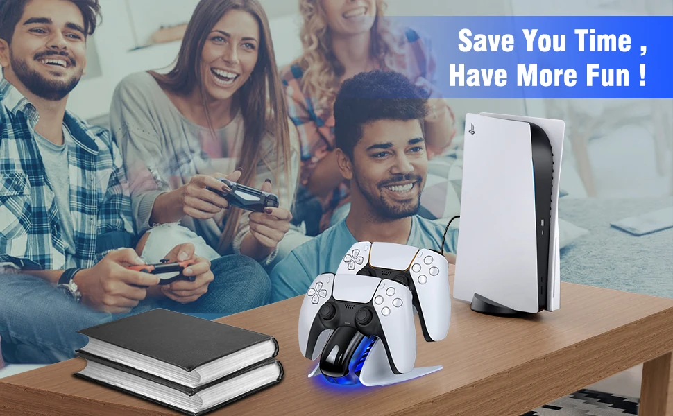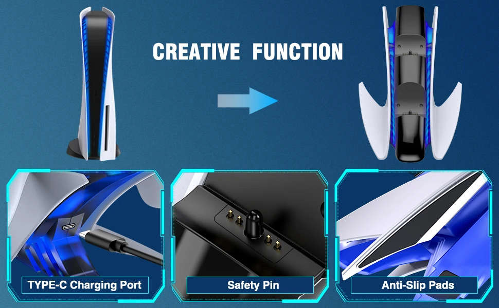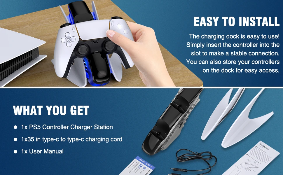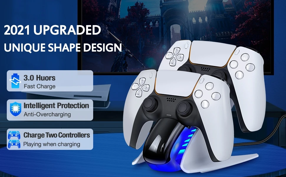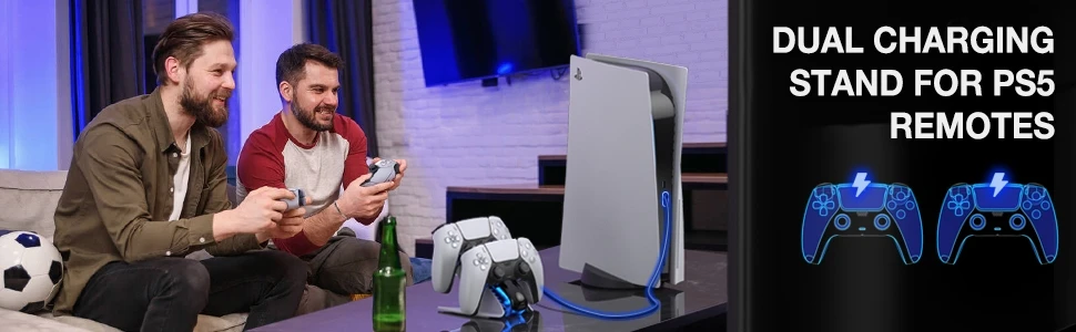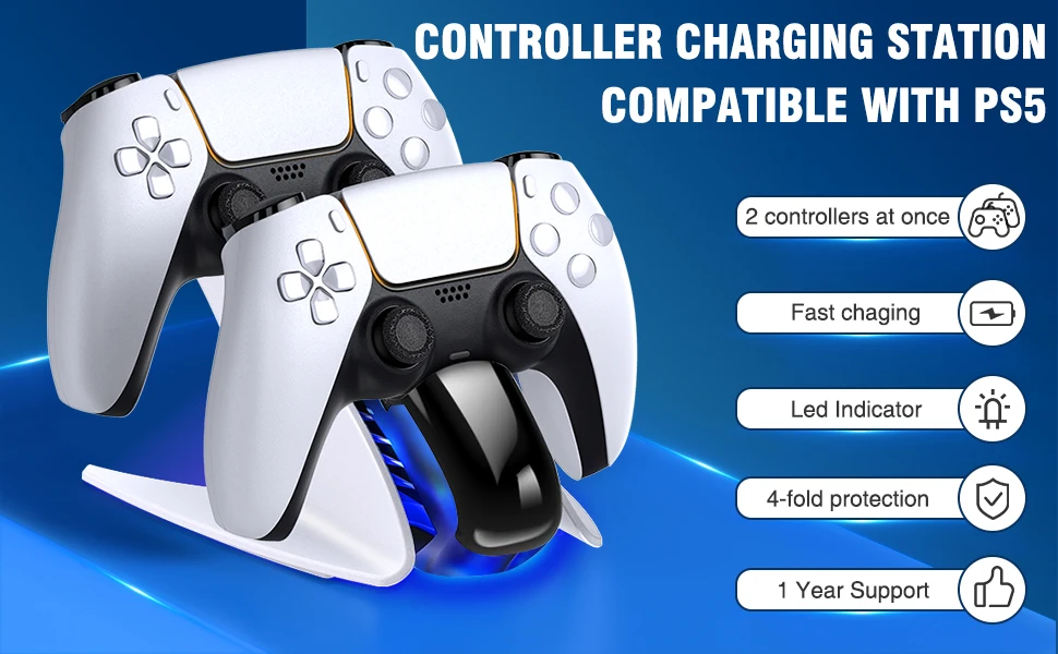 【새로운 PS5 의 룩과 라이트와 일치】Ps5 용 새로운 컨트롤러 충전기 스테이션은 매끄럽고 ps5 콘솔과 동일한 스타일을 유지합니다. ps5 의 테마와 일치하고 ps5 의 콘솔 옆에 멋지게 보입니다. 컨트롤러를 p5 충전 슬롯에 놓으면 파란색으로 켜져 충전 중임을 알 수 있습니다. p5 콘솔과 동일한 색상의 조명이 보이며 ps5 게이머에게 꼭 필요한 것입니다.【2.5 H 고속 충전 듀얼 컨트롤러】듀얼 ps5 컨트롤러 고속 충전을위한 긴 USB C 케이블과 함께 제공되며 완전히 충전되는 2.5 시간 동안 2 p5 듀얼 센스 컨트롤러를 충전합니다. 긴 게임 세션 동안 많은 시간을 절약 할 수 있습니다. 2 ps5 듀얼 센스 컨트롤러 충전을위한 훌륭한 솔루션이며 항상 ps5 충전 도크에 백업 충전 컨트롤러가 있습니다.【과충전 보호 】충전 도크에 ps5 용 컨트롤러를 떨어 뜨려 잊어 버리십시오. 스마트 칩이 탑재 된 ps5 용 충전기 스테이션은 ps5 용 컨트롤러가 과충전되는 것을 방지합니다. 과충전 방지 기능은 완전 충전에 도달 한 후 컨트롤러 충전을 천천히 중지합니다. Ps5 용 컨트롤러에서 과충전 문제가 발생할 염려는 없습니다.【쉽게 드롭 및 충전】Ps5 용 컨트롤러를 정렬하는 것이 쉽습니다. 재생이 끝나면 컨트롤러 만 도킹하면됩니다. 듀얼 센스 컨트롤러는 다운 할 때 올바른 충전 위치로 자연스럽게 밀려 들어가고 충전 할 때 즉시 주황색 빛이 피드백됩니다. 또한 ps5 를 위해 컨트롤러 충전 스테이션에서 완전 충전 된 컨트롤러를 매우 편리하게 잡을 수있어 ps5 용 원격 충전기로 게임 수명을 더 간단하게 만듭니다.【매력적인 스탠드 및 아담한 크기】Ps5 용 충전기는 듀얼센스 컨트롤러, 멋진 세련된 디자인 및 완벽하게 맞는 컨트롤러에 시원하고 편리한 스탠드를 제공합니다. 그리고 어디든 앉을 수 있을 만큼 작고 공간을 많이 차지하지 않습니다. 엔터테인먼트 공간을 깔끔하고 체계적으로 유지하며 모든 PS5 액세서리와 미적으로 일치합니다. ps5 플레이어에게는 필수