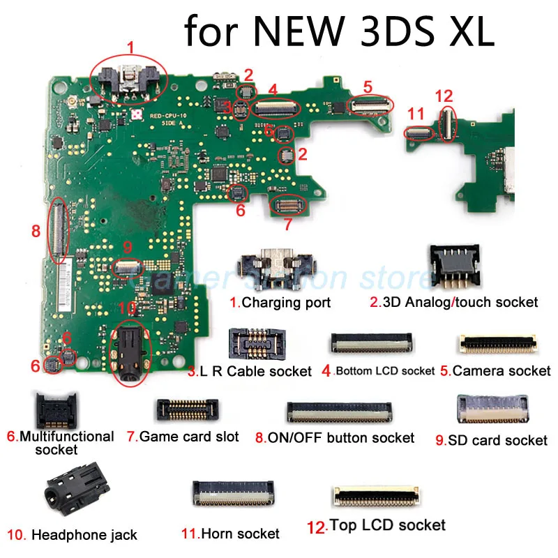 NEW 3DS XL 마더 보드 액세서리는 NEW 3DS 용 NEW 3DS LL과 호환되므로 해당 위치가 NEW 3DS 용 마더 보드 그림의 다른 위치가 표시되었습니다.