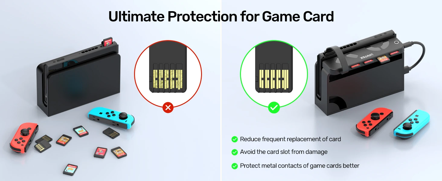 Unitek Nintendo Switch game card reader can largely reduce the frequency of inserting and removing game cards, prolonging the lifespan of your beloved game cards without damaging the game cards' metal contacts.