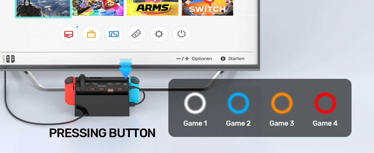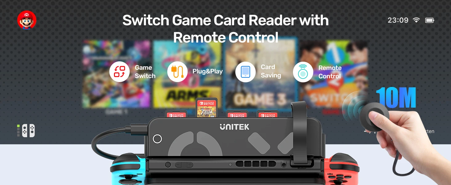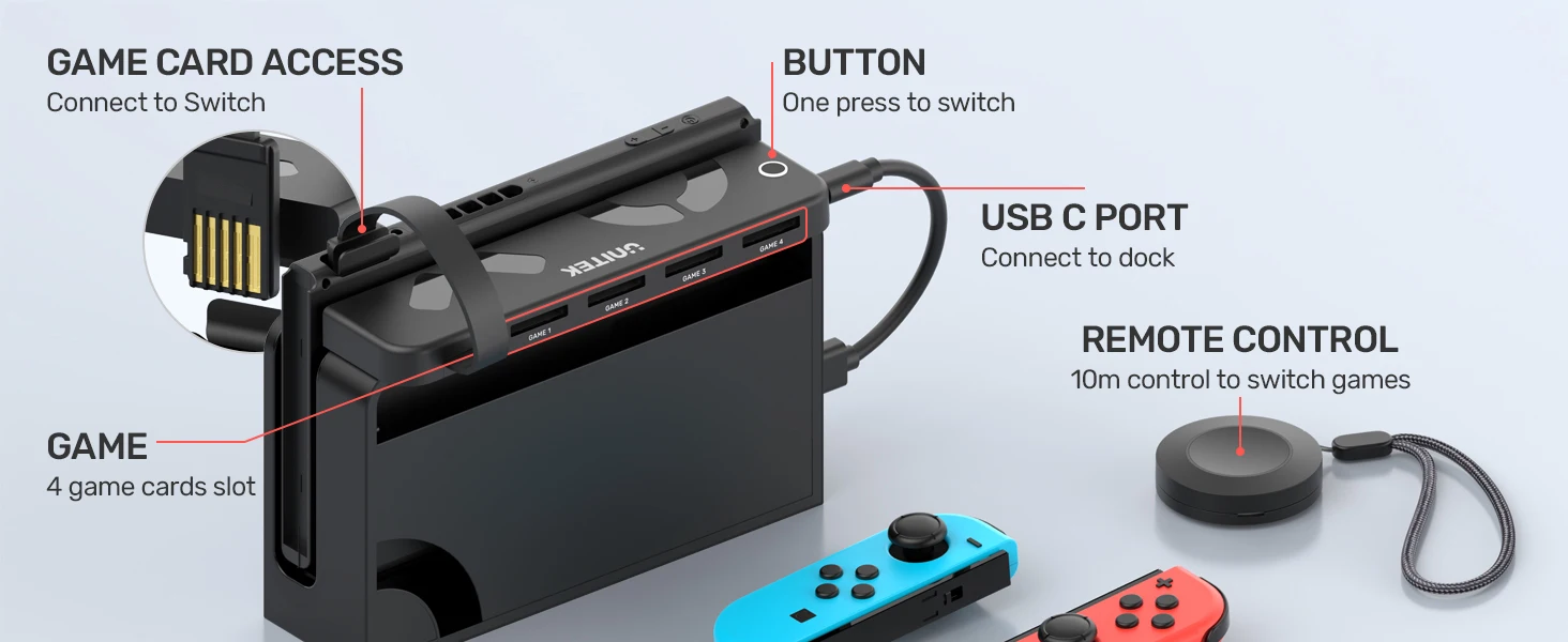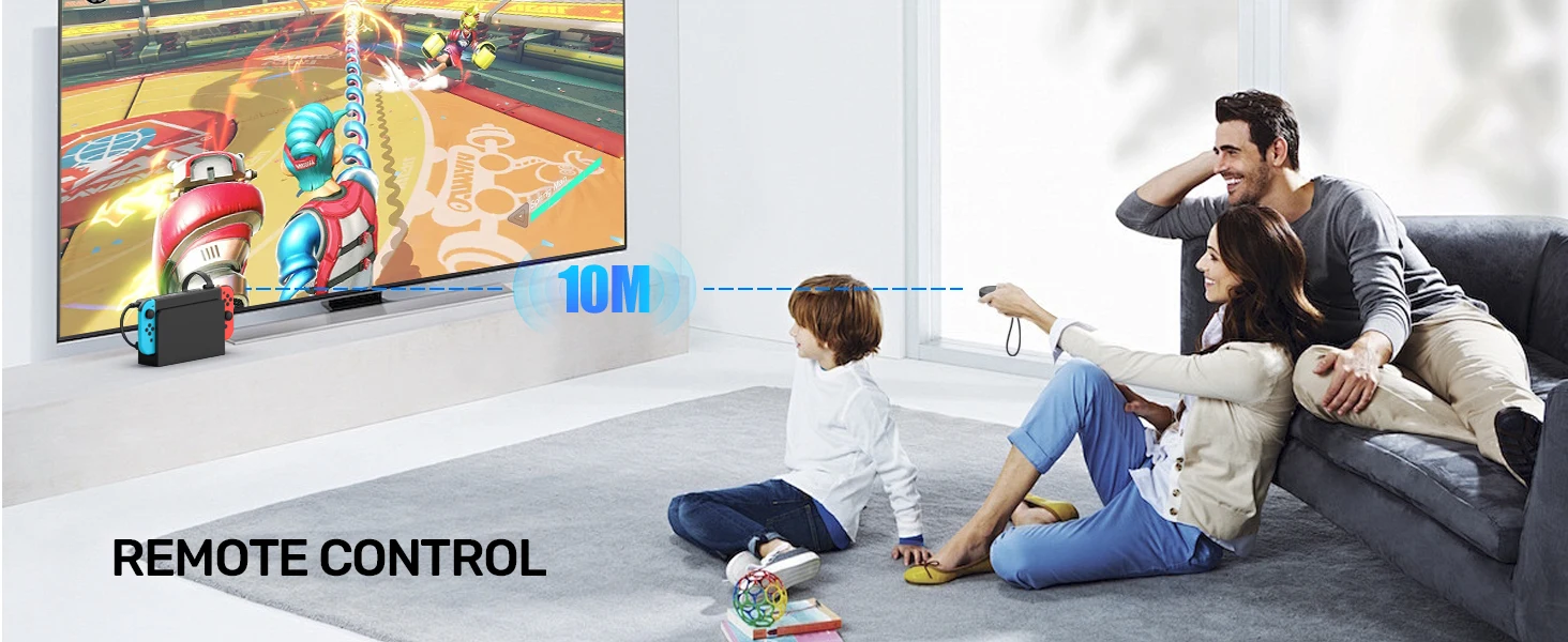 This UNITEK Switch game switcher equipped with a remote control that adapts the stable 433 MHz RF radio frequency technology whose identification distance can reach 10m (without obstructions).You can switch games online easily which solve the inconvenience of get up to switch games.