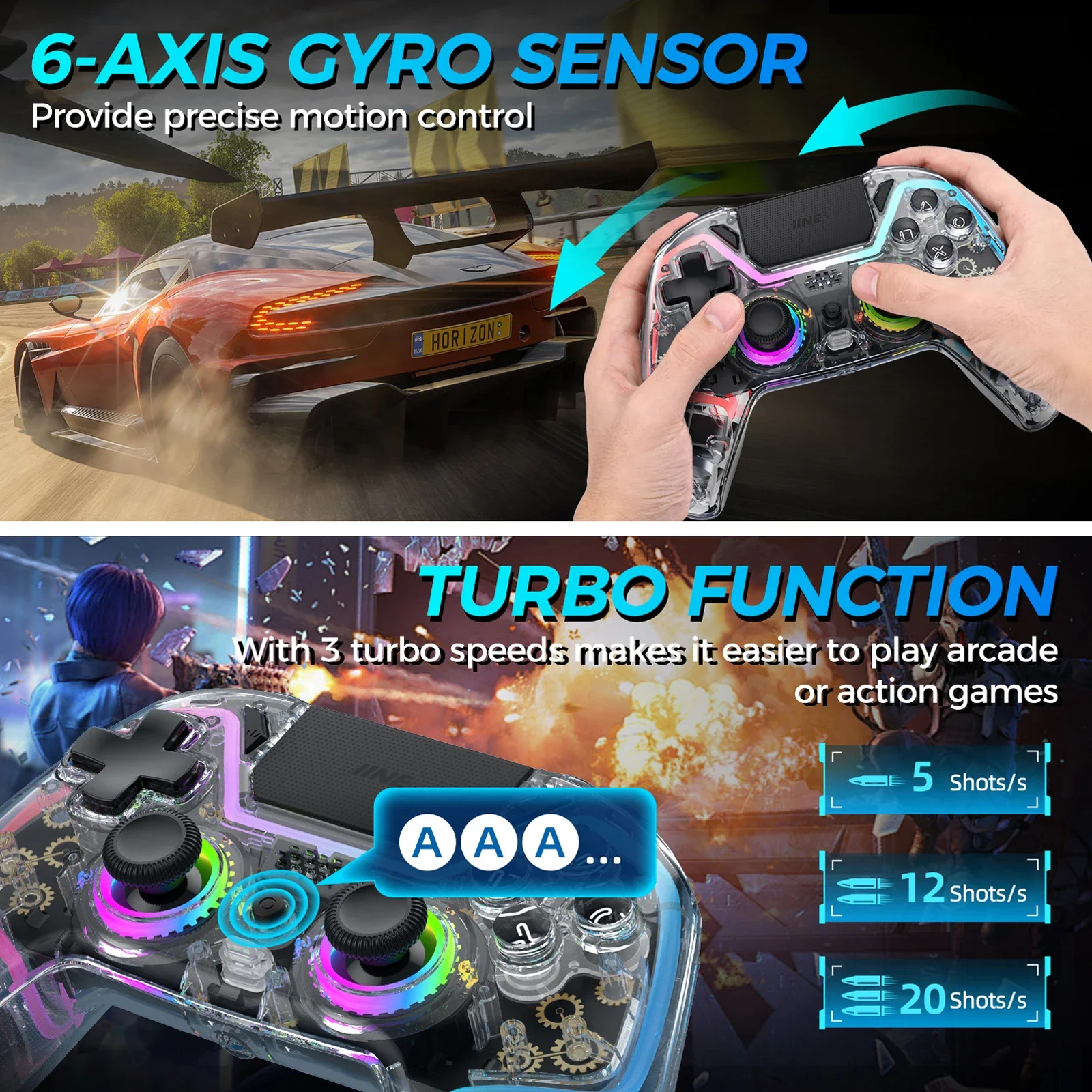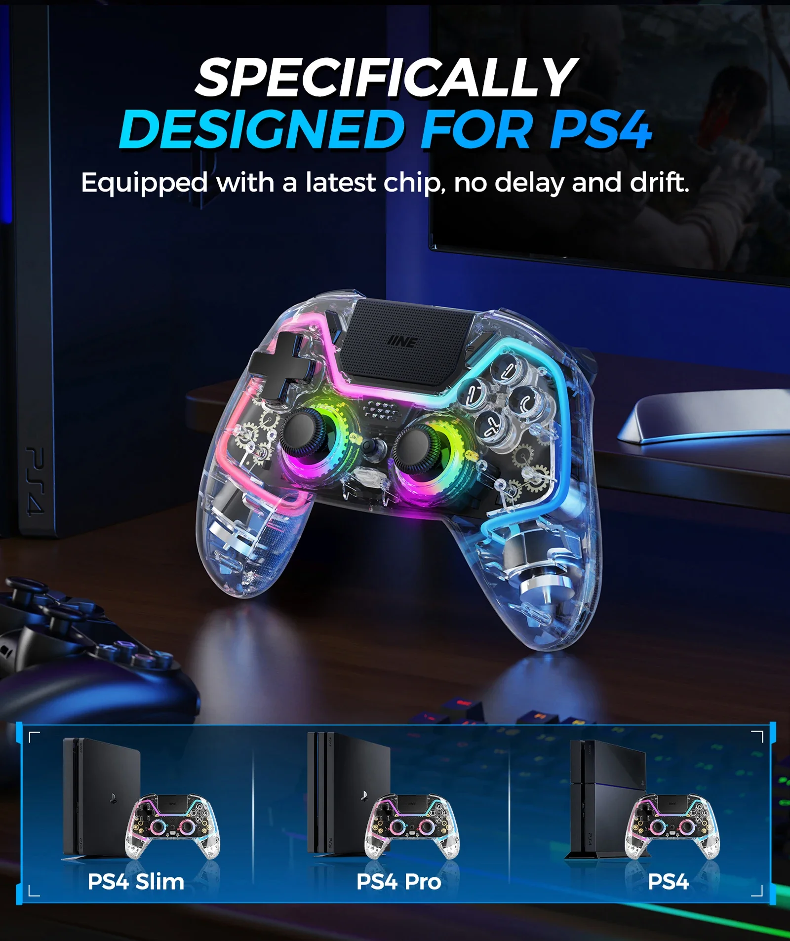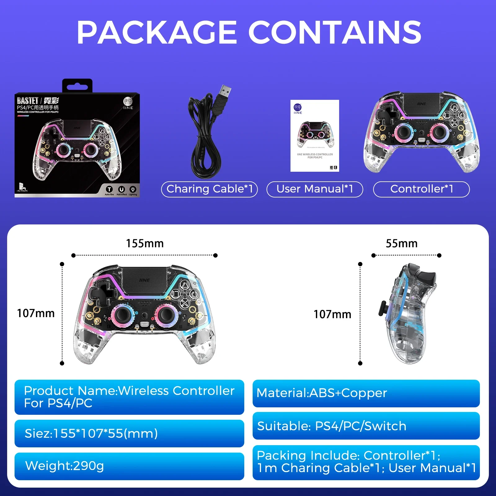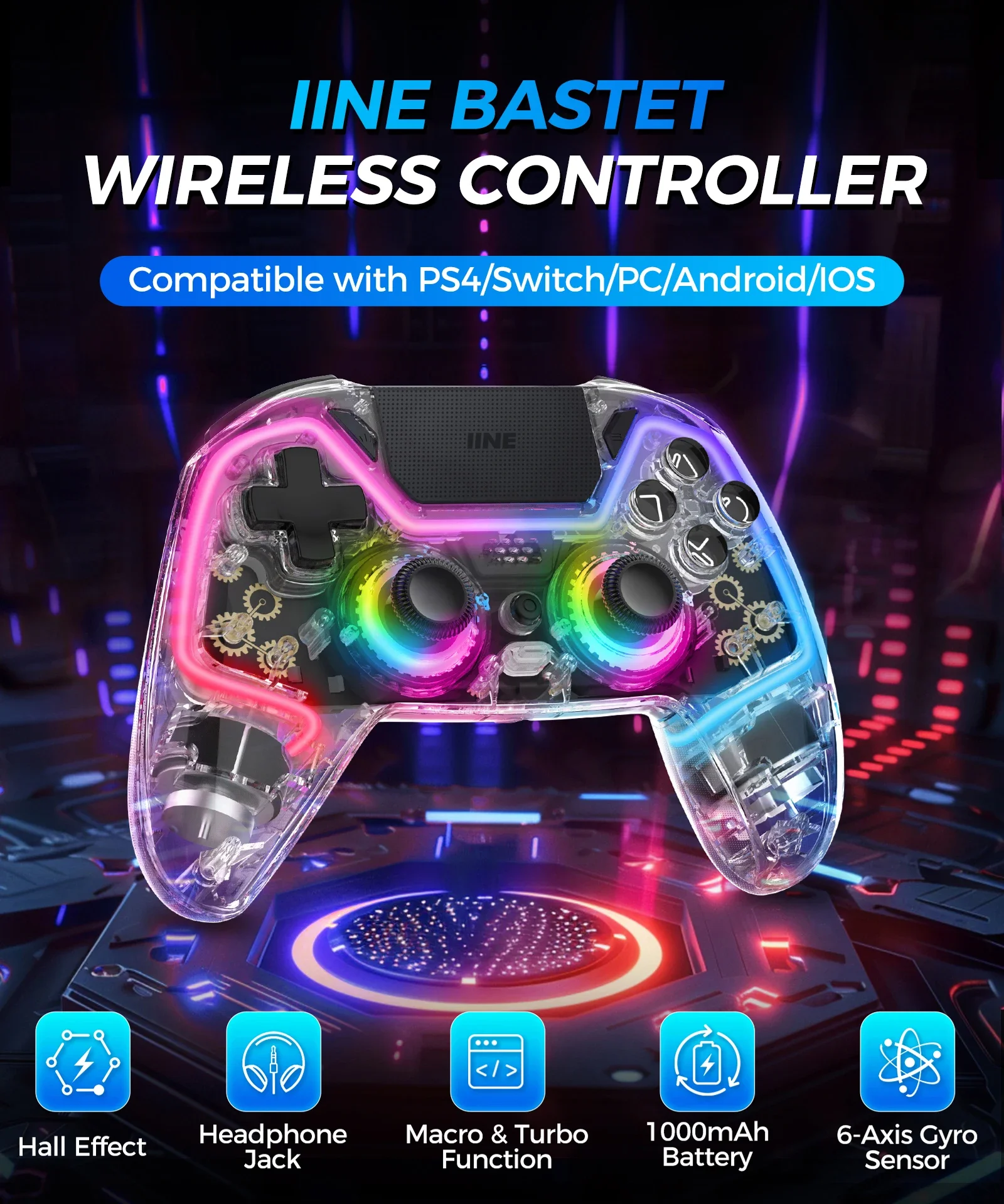 IIE Bastet 무선 컨트롤러 홀 이펙트 조이스틱 및 트리거 터치 패드 포함 PS4 스위치 PC 안드로이드 IOS 호
