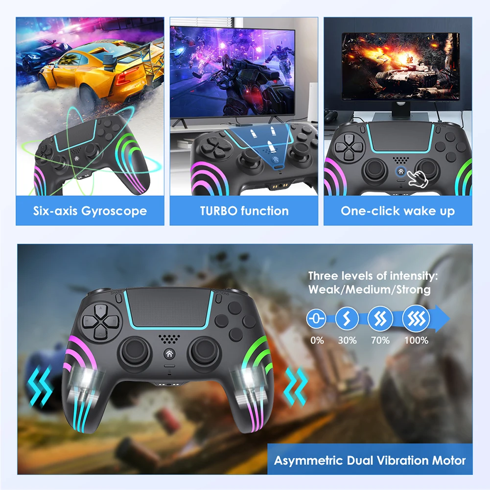 블루투스 호환 무선 컨트롤러 PS4 컨트롤러/Windows PC와 호환되는 이중 진동 무선 게임패드 게임 콘솔 컨트롤러 특징: 1. 고감도 터치 패드:무선 컨트롤러의 고감도 터치 패드로 매끄럽고 지연없는 게임 플레이를 경험하여 모든 움직임에서 정밀 제어를 보장합니다. 2.RGB 조명 효과:소프트웨어가 필요하지 않으면이 원격 게임 패드의 바로 가기 키를 사용하여 RGB 조명 효과를 쉽게 조정하여 세 가지 조명 모드로 매력적인 게임 분위기를 조성하십시오. 3. 정밀 홀 조이스틱:이 무선 게임 패드의 360 ° 고정밀 홀 조이스틱은 편안한 그립감과 부드러운 부드러운 컨트롤을 제공하여 플레이어가 조준과 같은 도전적인 게임 내 동작을 쉽게 실행할 수 있도록 도와줍니다. 4. 배터리 수명 연장:1000mAh 충전식 배터리로 자주 충전하는 것에 작별 인사, 이 게임 콘솔 컨트롤러는 최대 20 시간의 연속 재생 시간을 제공하고 전력 손실의 불안을 제거합니다. 5. 몰입 형 트리거 및 다양성:빠른 응답과 원활한 작동을 위해 백만 회 이상의 프레스를 위해 설계된 게임 컨트롤러의 홀 선형 트리거로 실제 스로틀의 스릴을 느껴보십시오. 또한 PS4/PC (Win7/8/10) 와 호환, 3.5mm 오디오 잭을 통해 실시간 통신을 통해 멀티 플랫폼 게임을 즐길 수 있습니다. 맞춤형 게임 경험을 위한 맞춤형 듀얼 백 버튼.