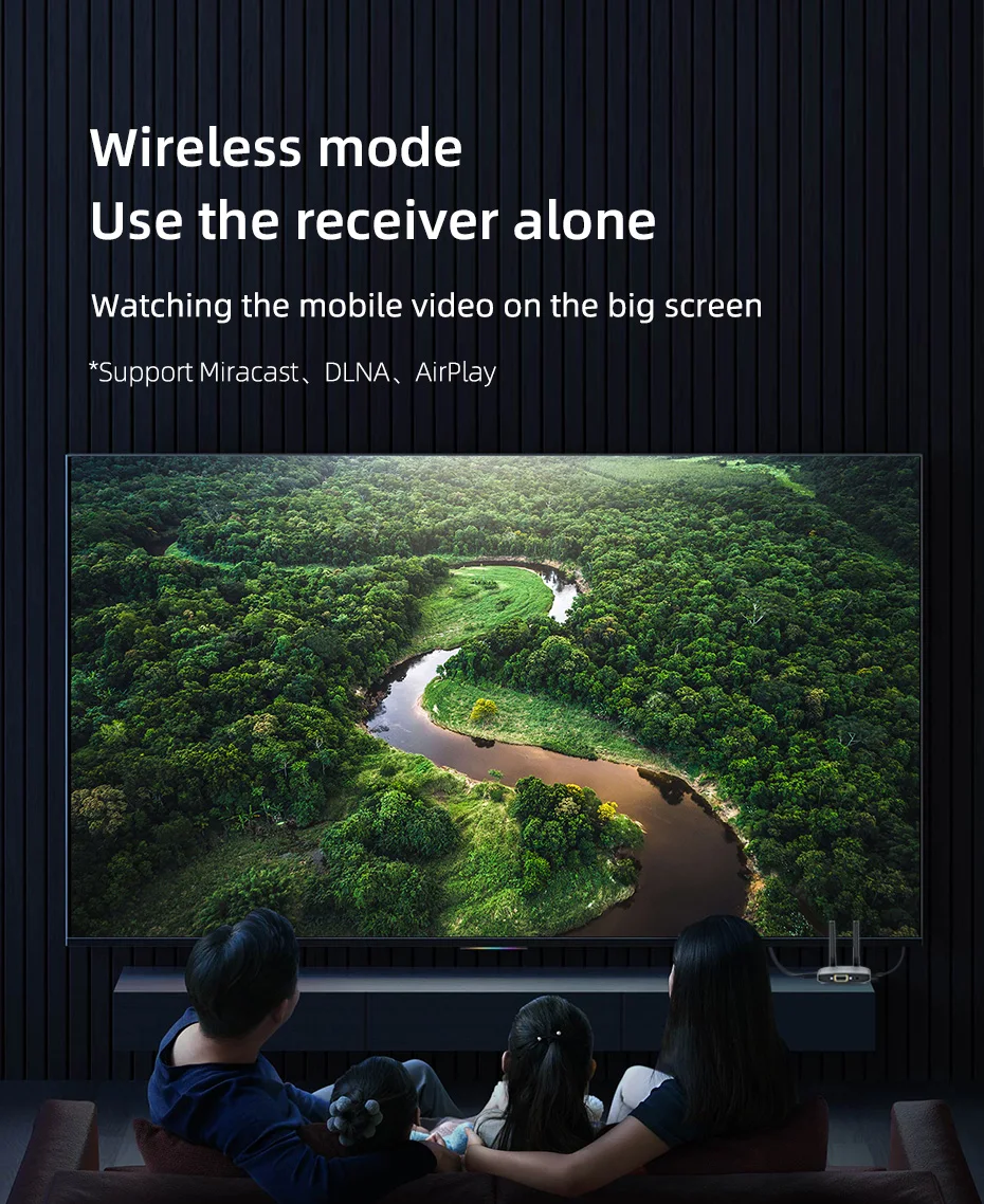 【다대일 모드】8 개의 송신기를 동시에 하나의 수신기, 한 번의 클릭 스위치에 연결할 수 있으며 서로 간섭하지 않으며 여러 화면을 공유 할 수 있습니다. * 참고: 이 작업은 송신기를 추가로 구입해야하며 1 개의 수신기는 최대 8 개의 송신기를 지원할 수 있습니다.