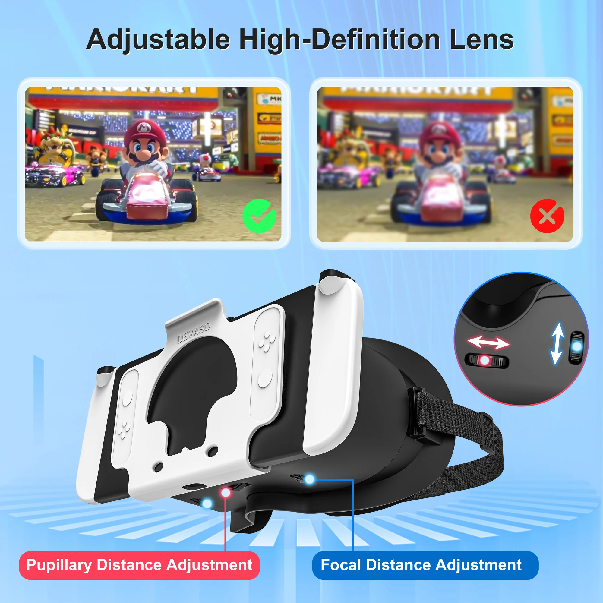 【골판지 재료에 작별 인사】: EVA 및 옥스포드 소재로 제작, 초경량 및 내구성, 습한 날씨에 VR 유리에 곰팡이가 생길 염려 없음, 조절 가능한 헤드스트랩과 얼굴에 닿을 수 있는 더 두꺼운 소재가 포함되어 있어 스위치 콘솔을 머리 근처에서 잡을 필요가 없습니다.