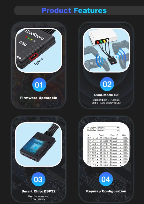 Gamecube 콘솔 용 멀티 플레이어 블루투스 호환 컨트롤러 어댑터 인 BlueRetro 는 다스 클라우드 기반의 오픈 소스 프로젝트입니다. 인기있는 ESP32 칩을 사용합니다. 오리지널 Wii, 스위치, , PS4, PS5, Xbox One 콘솔 무선 컨트롤러를 지원할 수 있습니다. 이 새로운 어댑터는 최대 4 개의 연결된 Bluetooth 호환 컨트롤러를 동시에 사용할 수 있습니다.