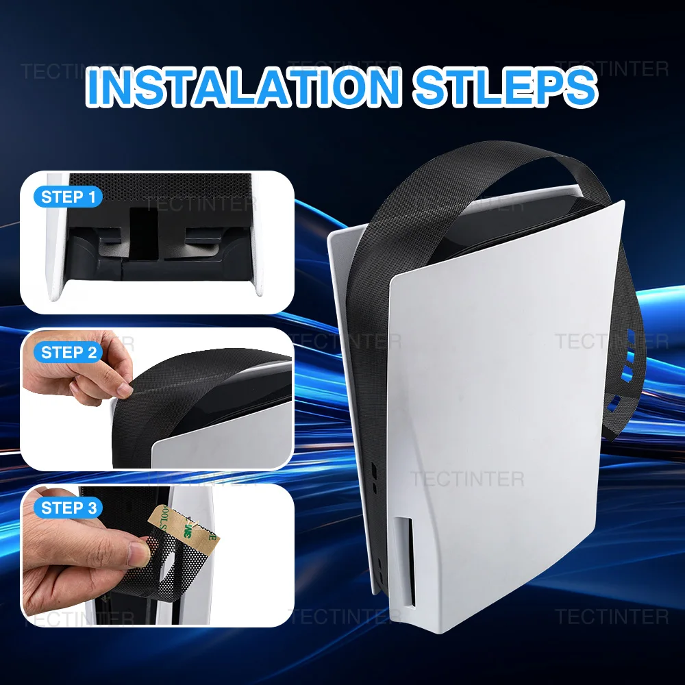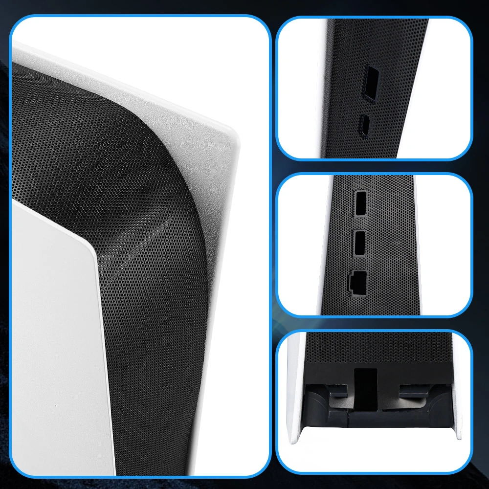 콘솔의 필터 덮개 3면: 전면, 후면, 상단.PS5 콘솔에 쌓이는 먼지와 애완동물 털을 줄이고 PS5 콘솔 중간 스킨에도 사용하여 긁힘과 지문을 방지할 수 있습니다.