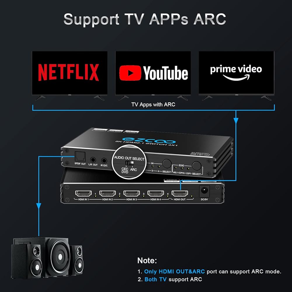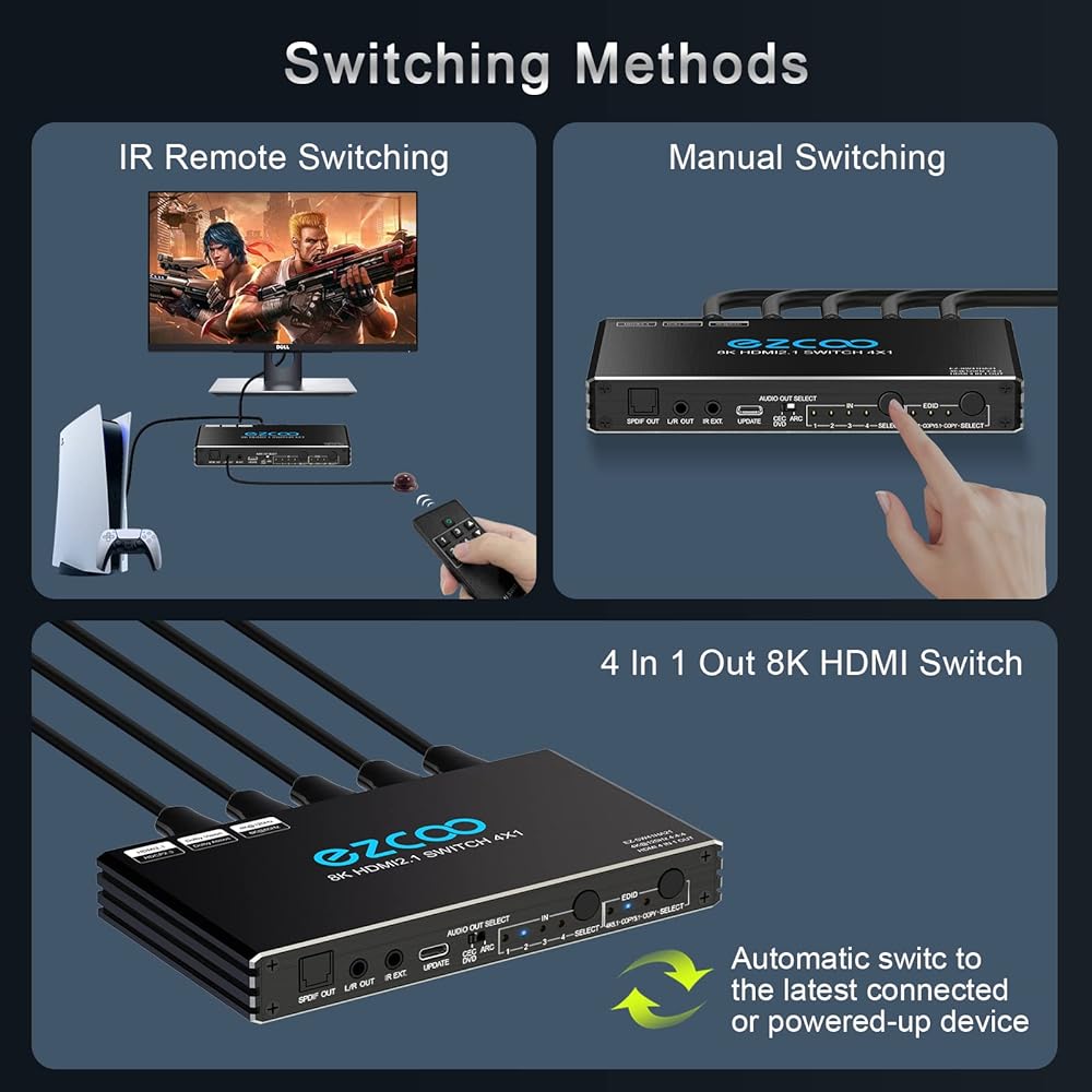 HDMI 스위치 8K 4x1 120Hz 48Gbp HDCP 2.3 ARC VRR CEC HDMI 스위처 4 in 1 Out 4 포트 HDMI 셀렉터 IR