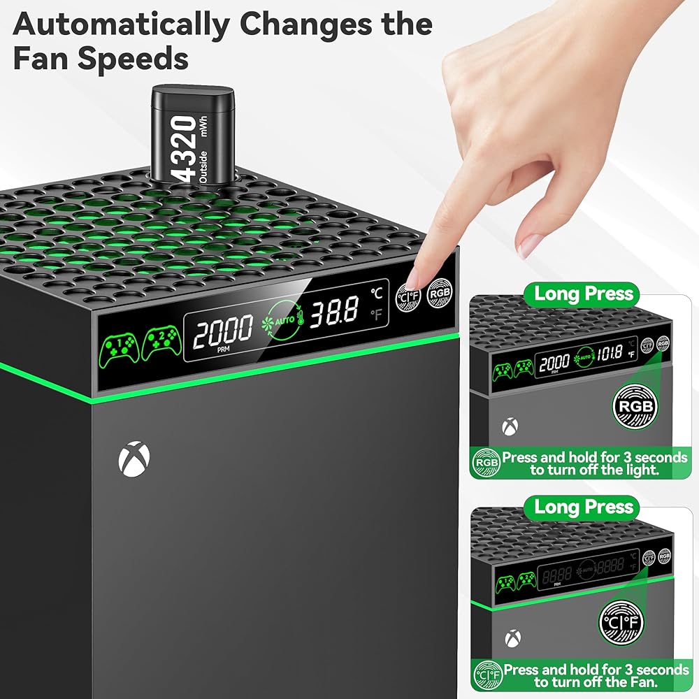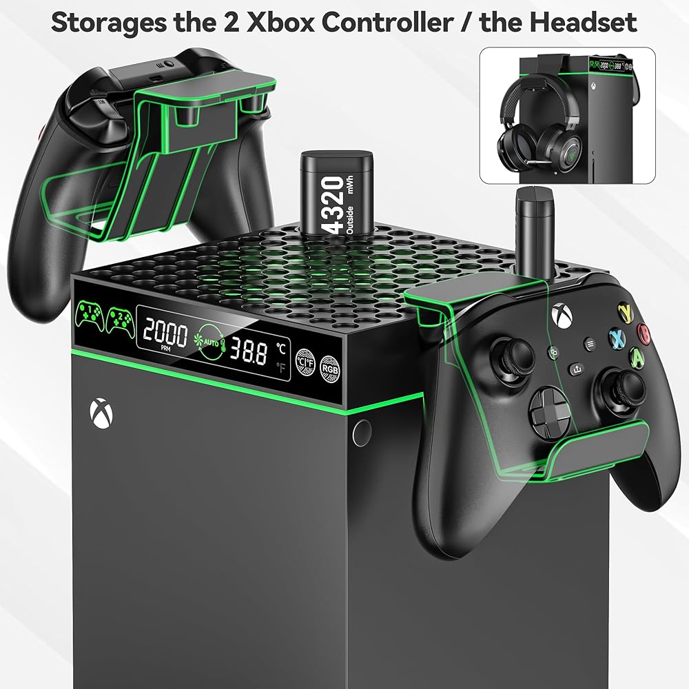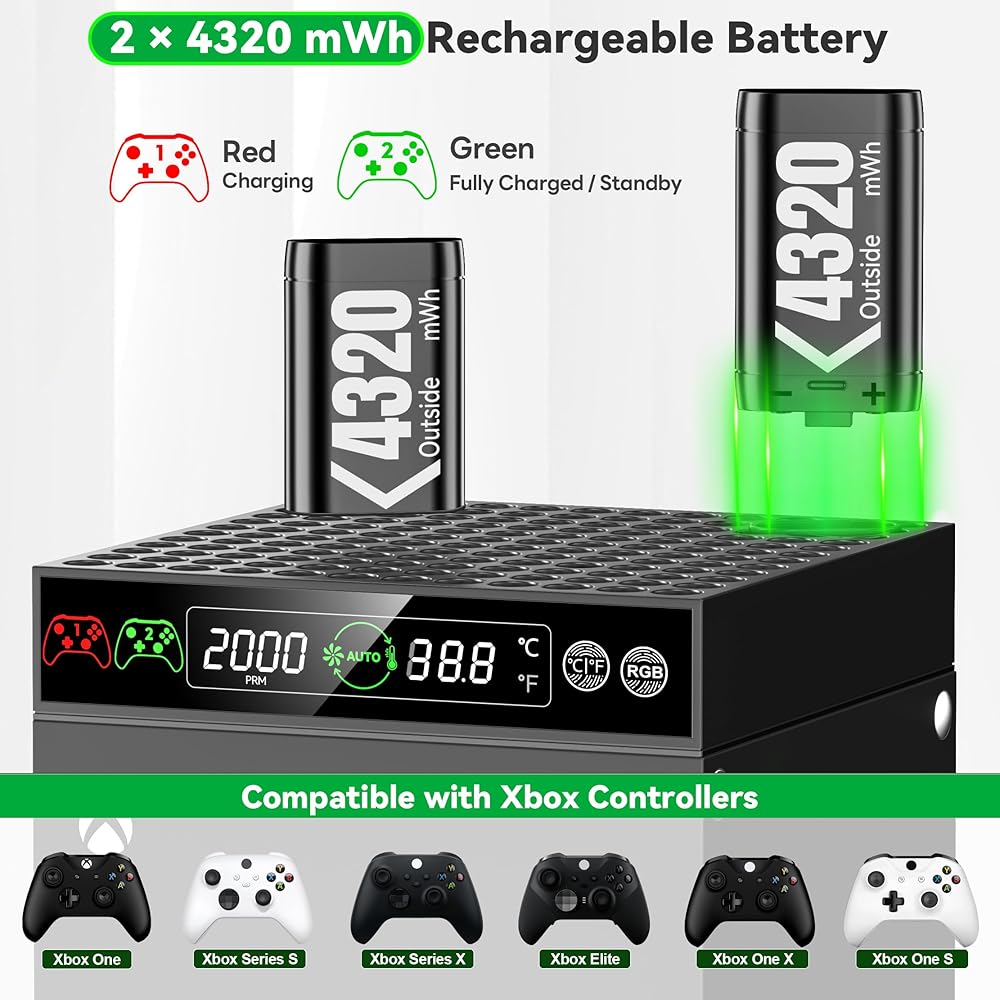 4320mWh 충전식 배터리 2팩이 장착된 Xbox Series X/S 콘솔용 LVVIL 자동 냉각 팬 팬 쿨러 컨트롤러 및