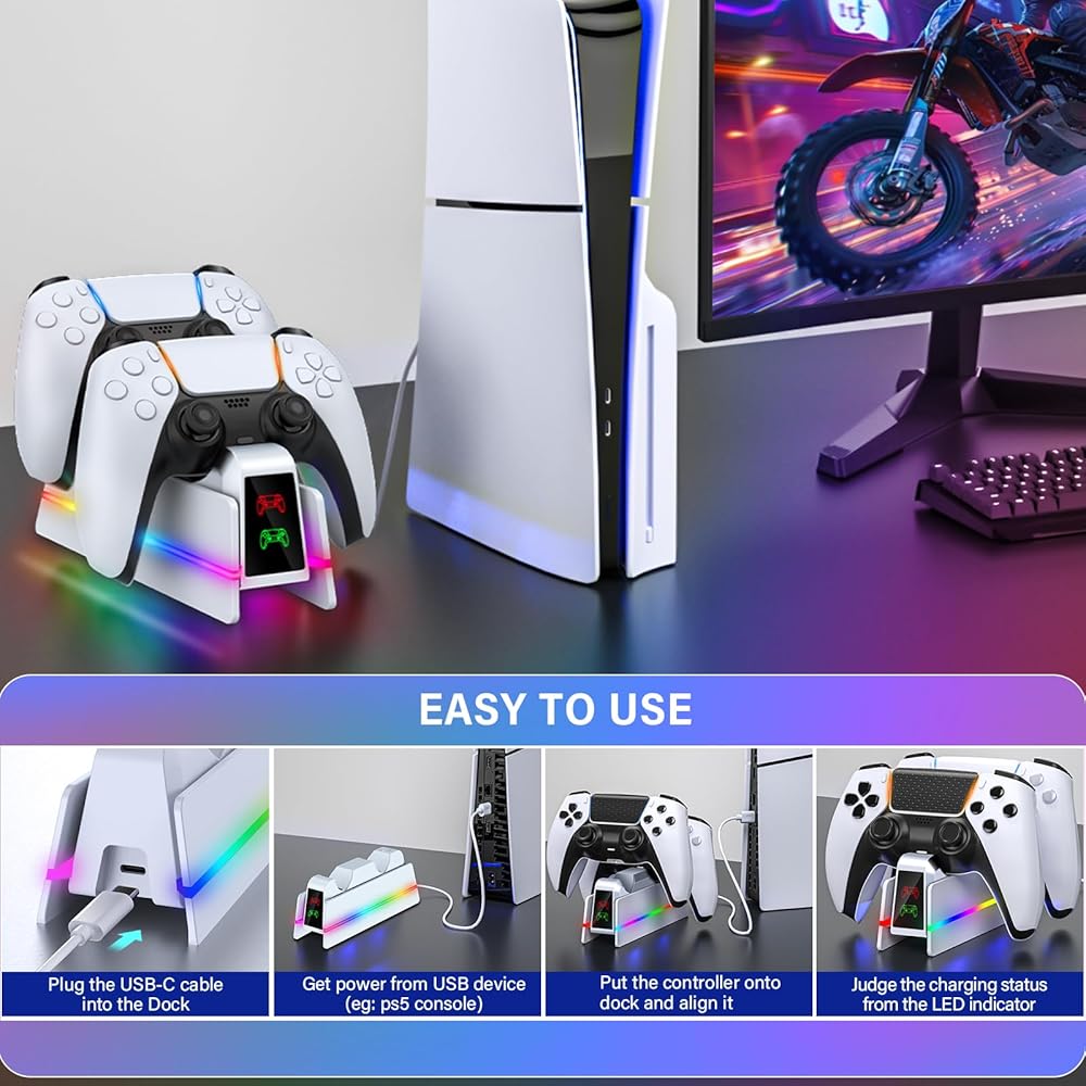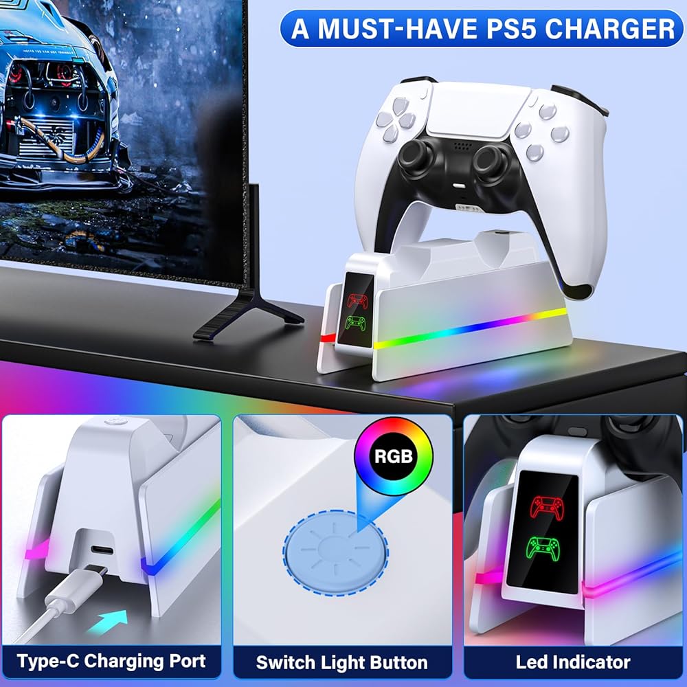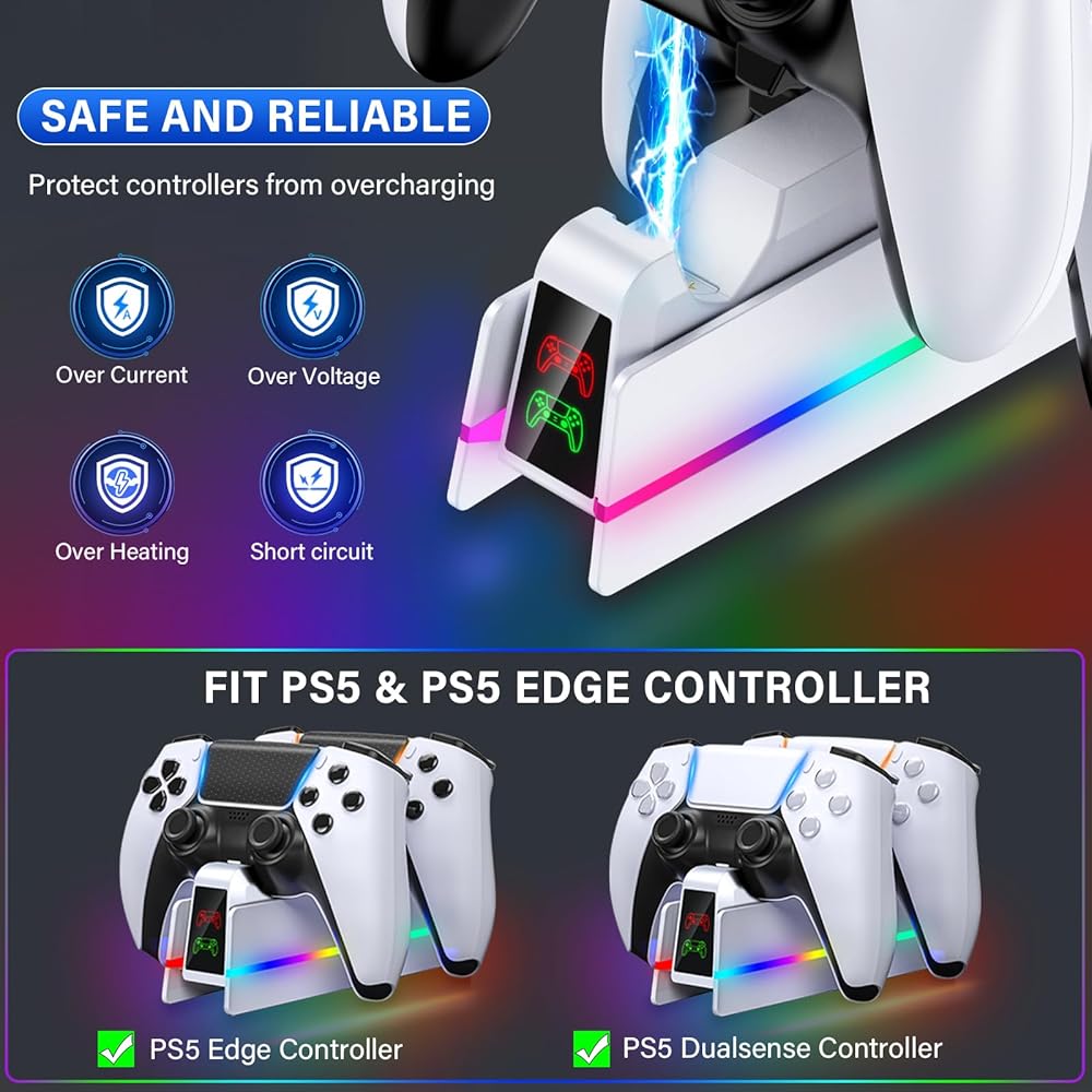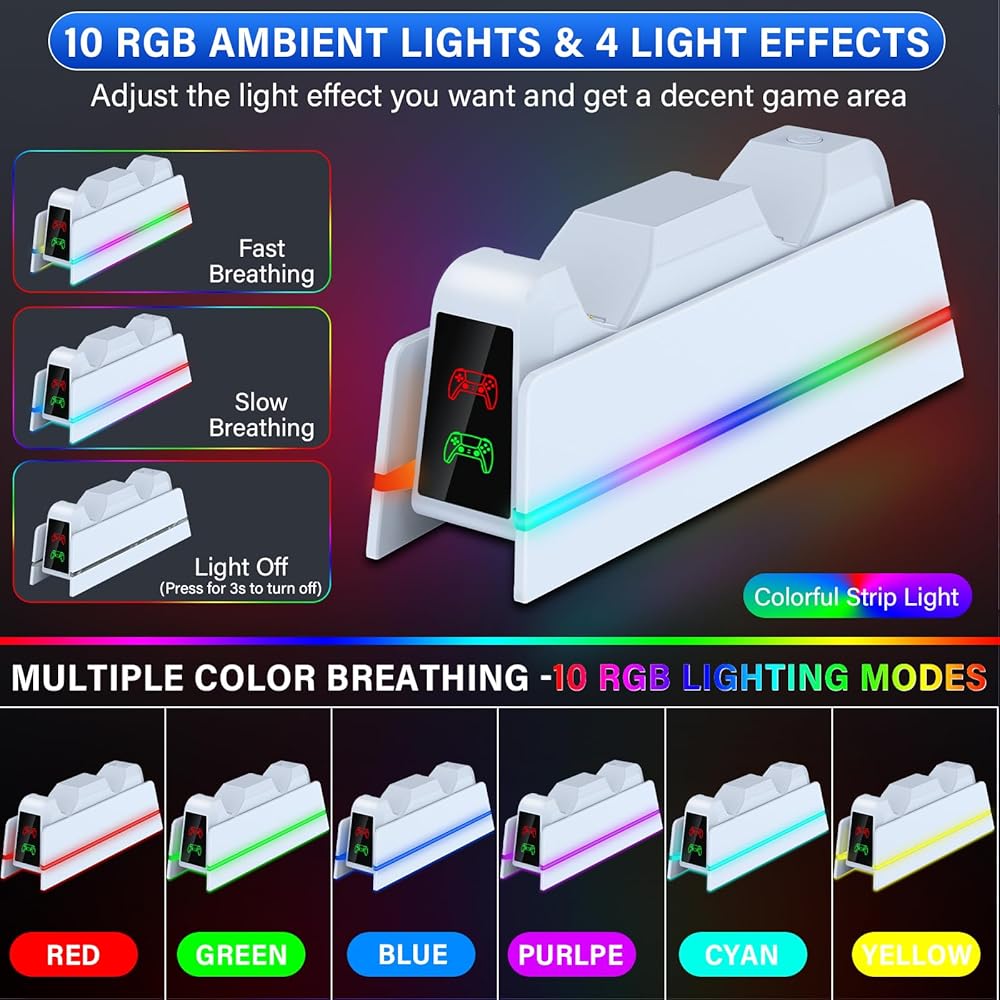 PS5-컨트롤러-충전 스테이션 - 9색 RGB LED 조명이 장착된 PlayStation 5 듀얼센스/엣지 컨트롤러용 충전