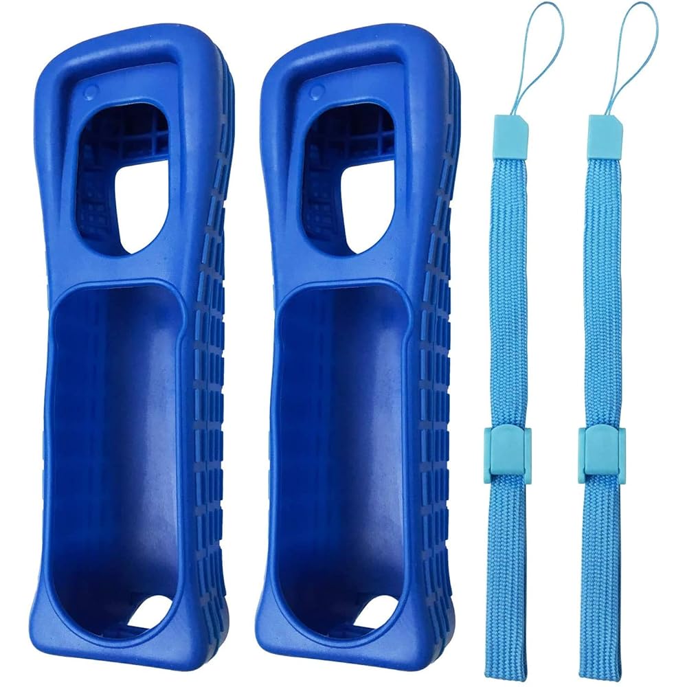 Wii 리모컨용 손목 스트랩이 있는 실리콘 스킨 케이스 커버 2개(파란색)