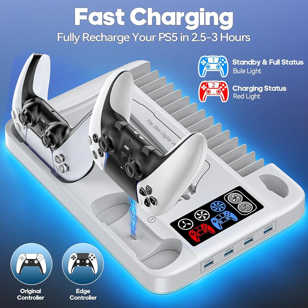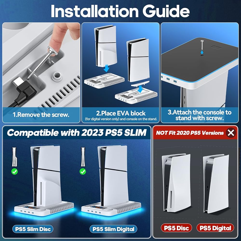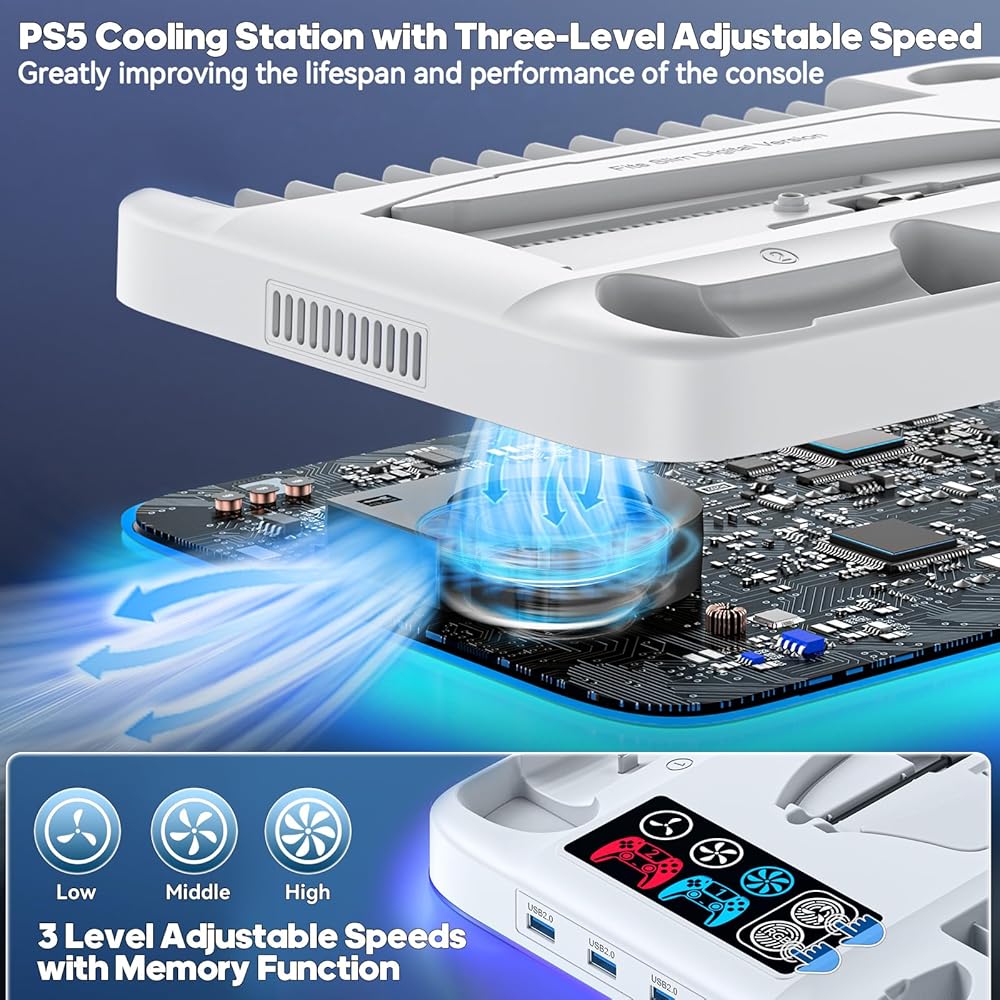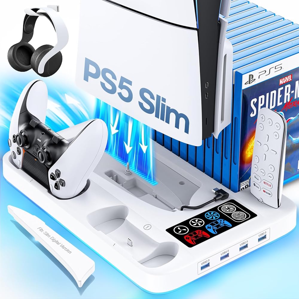 PS5 슬림 및 디지털용 리스커 PS5 쿨링 스탠드 사일런트 터보팬 및 컨트롤러 충전기가 있는 플레이스테이