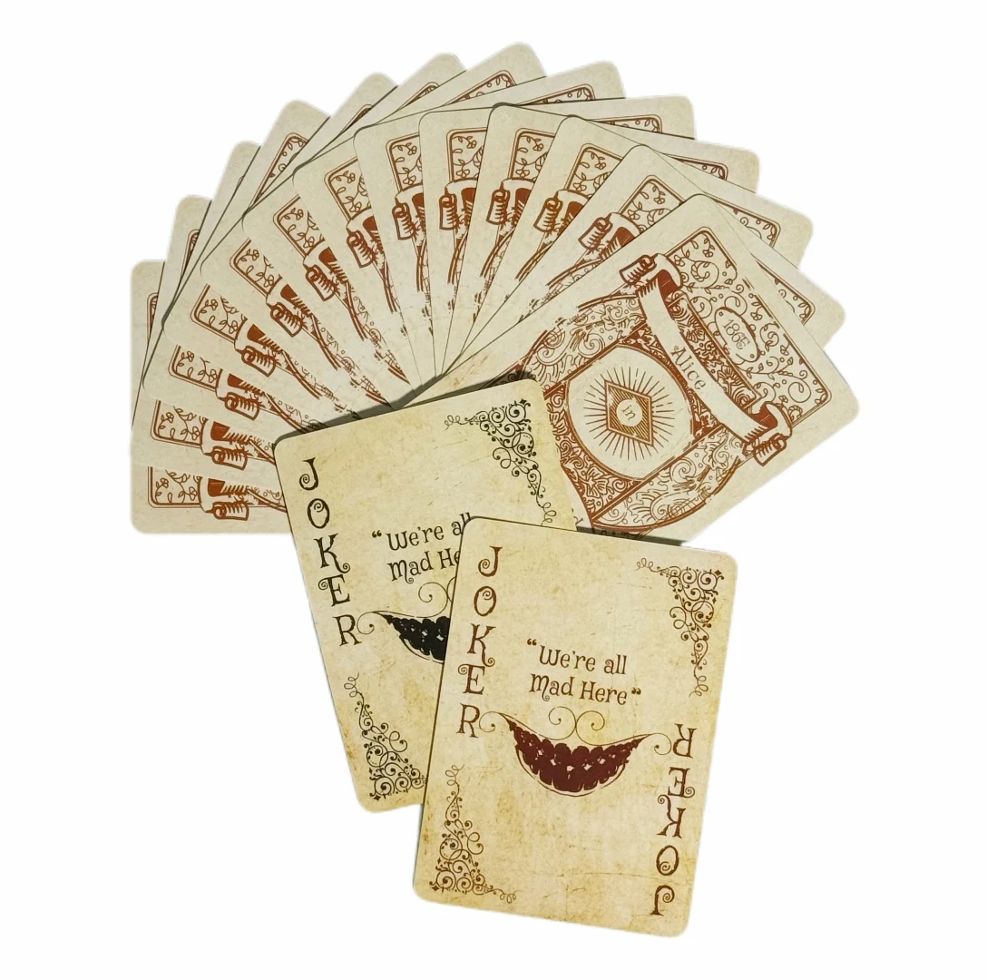 하나의 패키지에는 52 개의 적합한 카드와 2 개의 조커가 포함되어 있으며 원래 책의 앨리스, 매드 해터 및 화이트 래빗이 포함되어 있습니다.