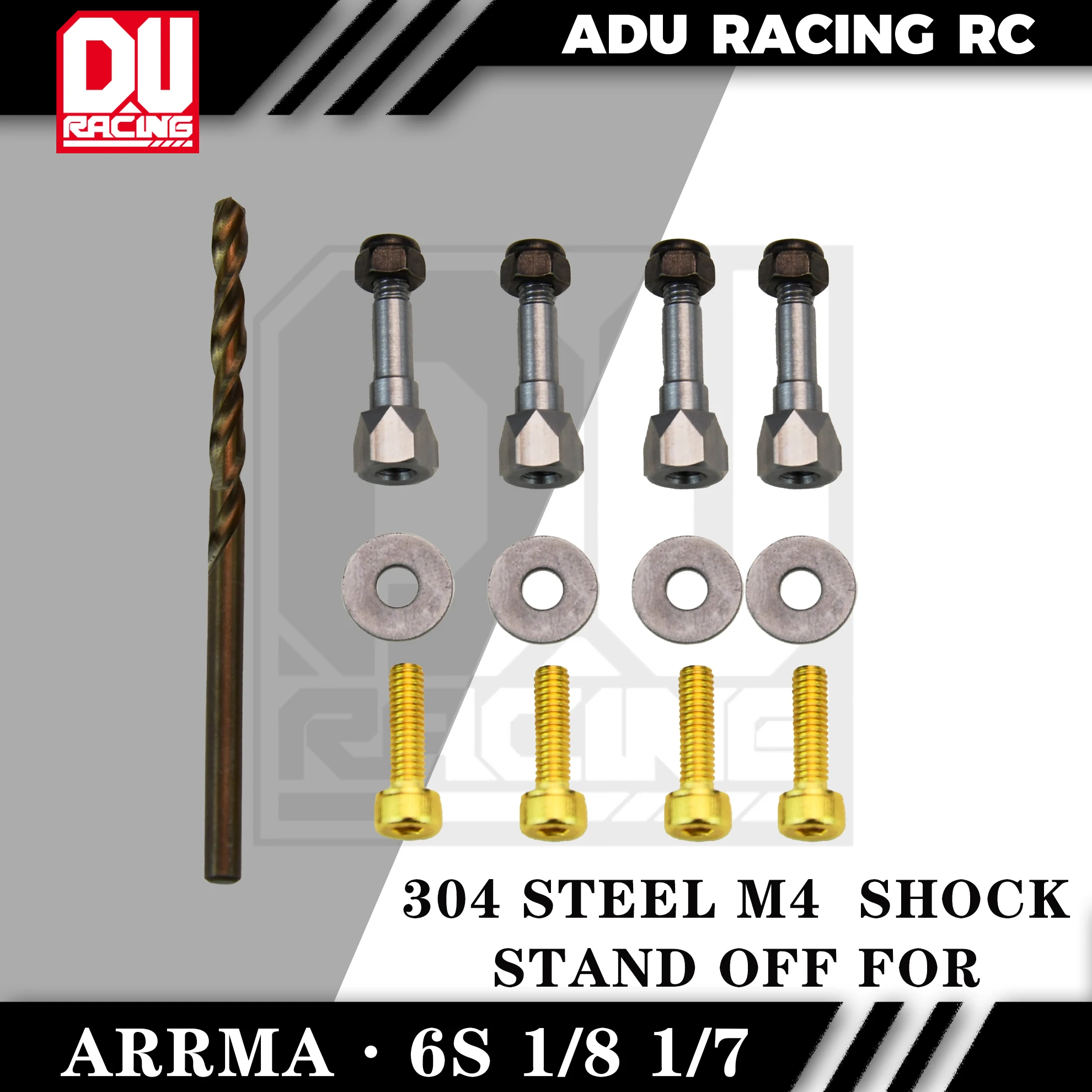 ADU 레이싱 304 스틸 쇼크는 Arrma 모든 1/8 및 1/7 자동차에 대 한 스탠드. 그것은 304 강철에서 가공. M4 나사를 사용 하기 때문에, 당신은 4mm 에 3mm 스톡 타워 구멍을 드릴 아웃 필요.