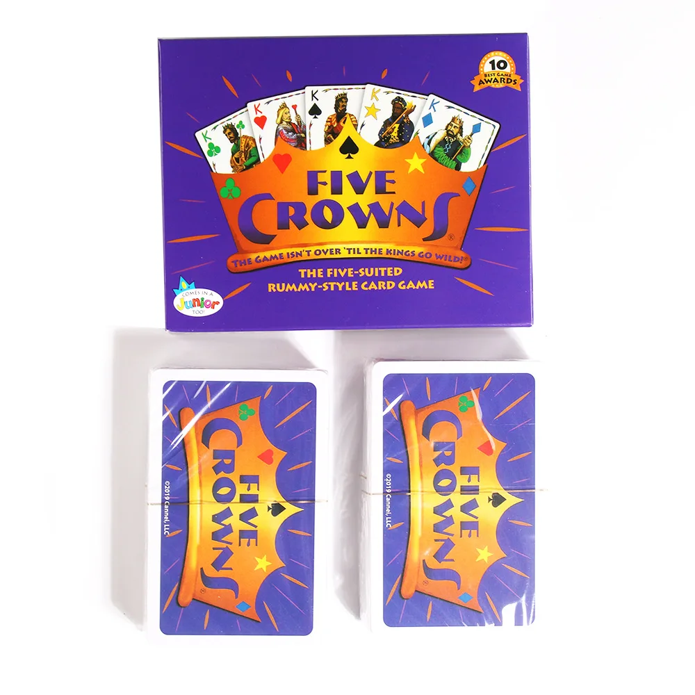 Five Crowns는 다양한 카드 플레이어에게 호소하는 5 가지 적합한 러미 스타일 카드 게임입니다! 이 클래식 게임은 스페이드, 클럽, 하트, 다이아몬드 및 별 등 5 가지 슈트가 포함 된 독특한 더블 데크를 갖추고 있습니다! 이 특수 데크를 사용하면 손 전체를 책과 달리기에 쉽게 배치 할 수 있습니다. 회전하는 와일드 카드는 플레이어를 발가락으로 유지합니다! 게임은 3 장의 카드로 시작하고 3 은 야생이고, 다음 라운드는 4 장의 카드가 있고 4 는 야생입니다. 올바른 조합을 만들고 가장 먼저 나간 다음 플레이어가 손실을 줄일 수있는 마지막 기회를 얻으면서 출격하는 것을 지켜보십시오! 어린이와 성인에게 훌륭한 상호 작용을 제공하는 재미 있고 중독성있는 가족 게임입니다!