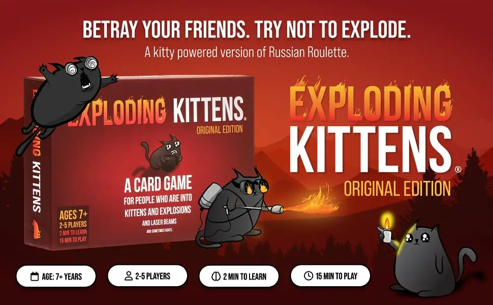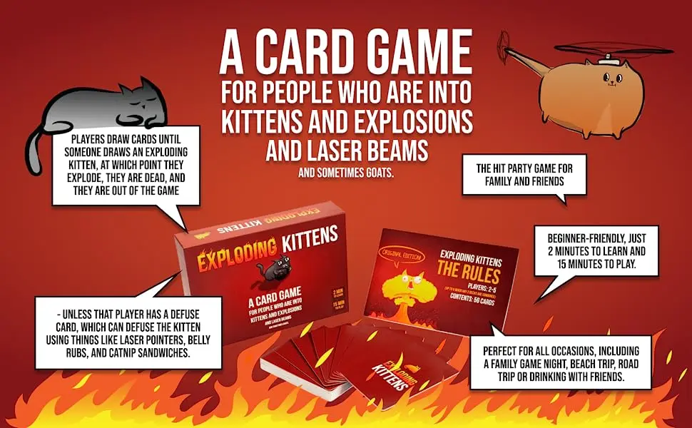 1. 두 명의 플레이어를위한 전설적인 오리지널:고양이에게 죽일 수있는 면허를 준 카드 게임. 전 세계의 더 많은 고양이에게 옆눈이 주어지는 이유-폭발하는 새끼 고양이: 오리지널 에디션! 이 키티 구동 카드 게임은 게임의 밤을 폭발로 바꾸는 것입니다. 폭발하는 새끼 고양이를 피하고, 길을 따라 친구를 배신하고, 휴대용 치타 엉덩이에 끈을 묶으십시오. 살아있는 마지막 플레이어가 승리합니다!