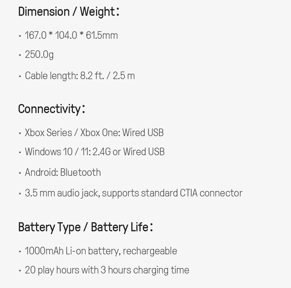 가능한 한 다재다능 유선 USB 통해 Xbox에 연결하고 2.4G 통해 Windows PC에 연결하거나 Bluetooth 통해 Android 장치에 연결하세요.