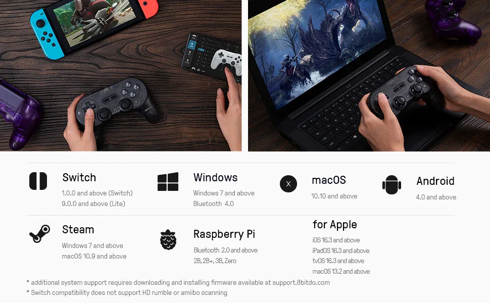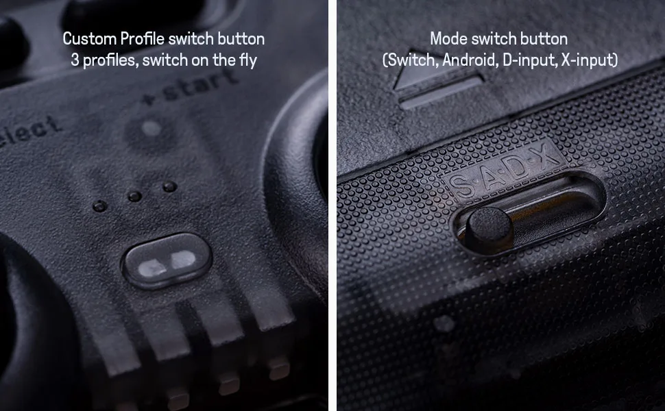 4방향 모드 스위치 버튼을 사 하면 스위치 S Mac OS A D 입력 D 및 X 입력 X 사이 즉시 전환할 수 있으므로 모든 장치에 최대한 쉽게 페어링할 수