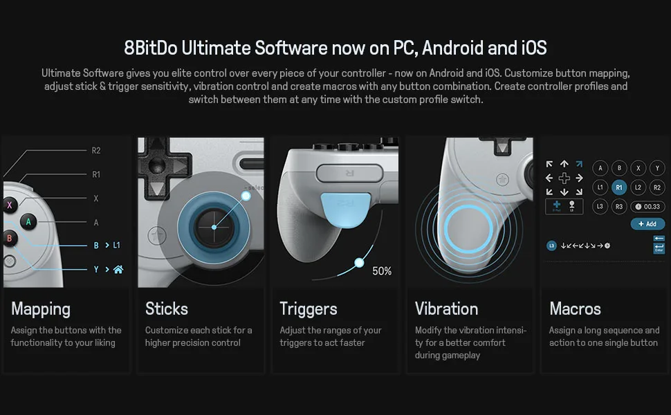 Ultimate Software 사 하면 이제 Android 및 iOS에서 컨트롤러의 모든 부분을 엘리트 제어할 수 버튼 매핑을 사 자 정의하고 스틱 및 트리거 감도 조정하고 진동 제어 수행하고 버튼 조합으로 매크로 생성하세요.컨트롤러 프로필을 생성하고 사 자 정의 프로필 스위치 사 하여 언제든지 프로필 간에 전환할 수