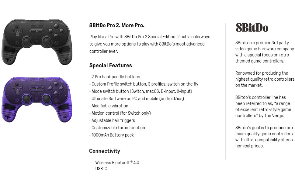 Pro 2에는 두 개의 Pro 수준 뒤로 버튼이 이 버튼을 사 하면 더 많은 제어가 가능하므로 엄지손가락을 엄지스틱에서 떼지 않아도 됩니다.8BitDo Ultimate 소프트웨어 사 하면 모든 버튼 기능과 매크로 할당할 수도