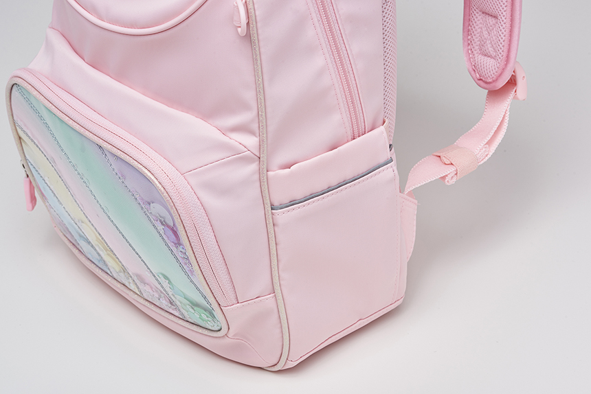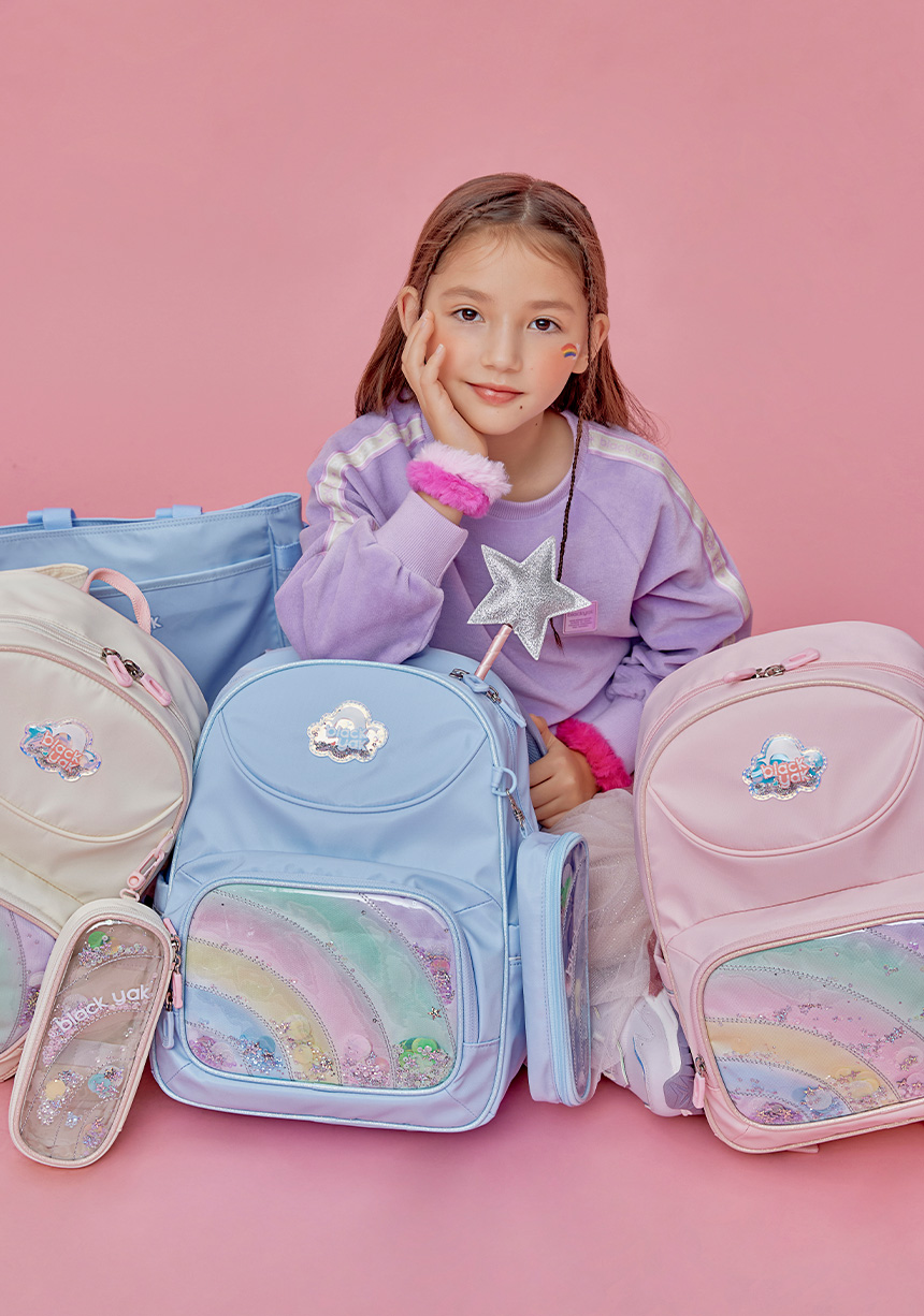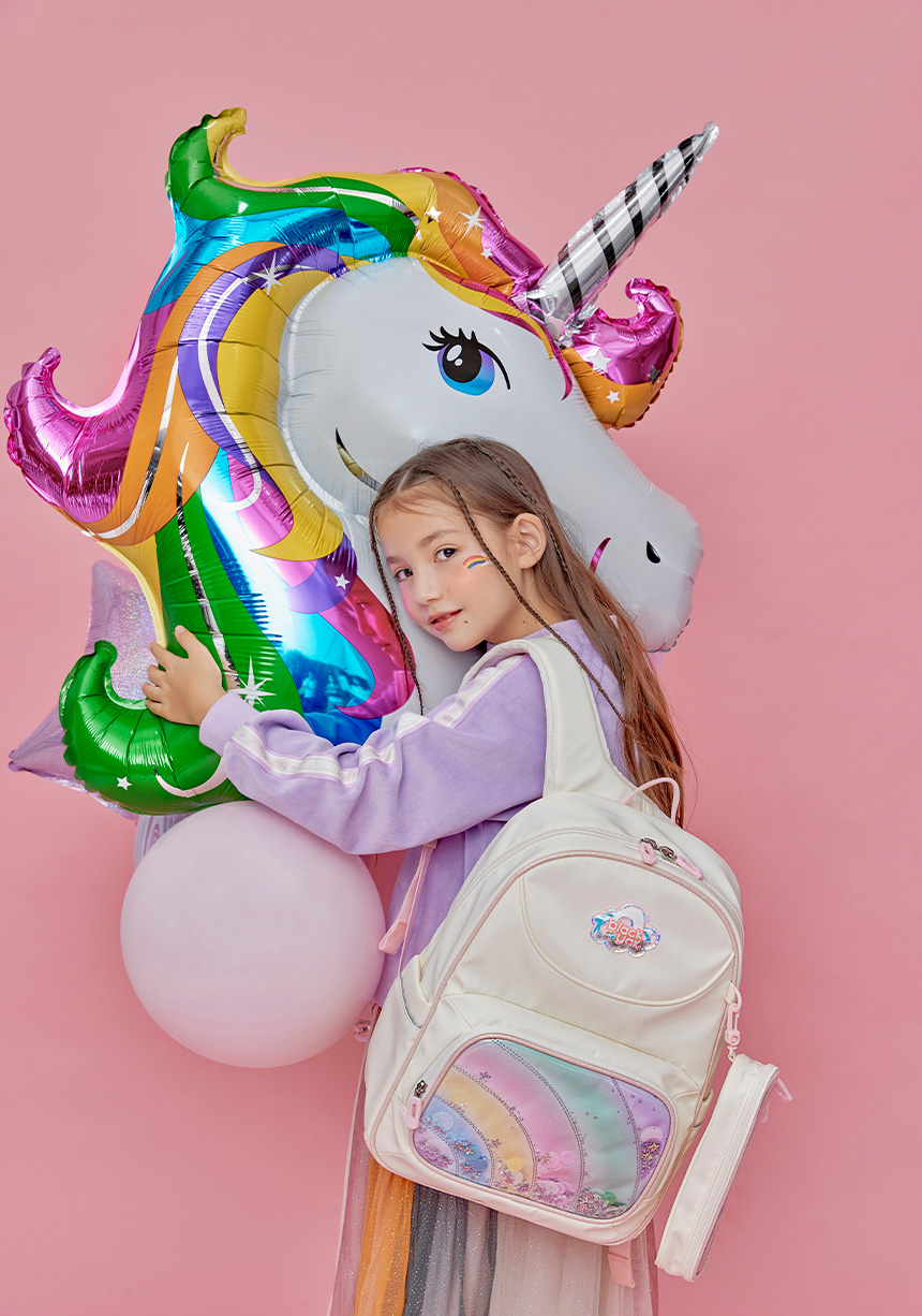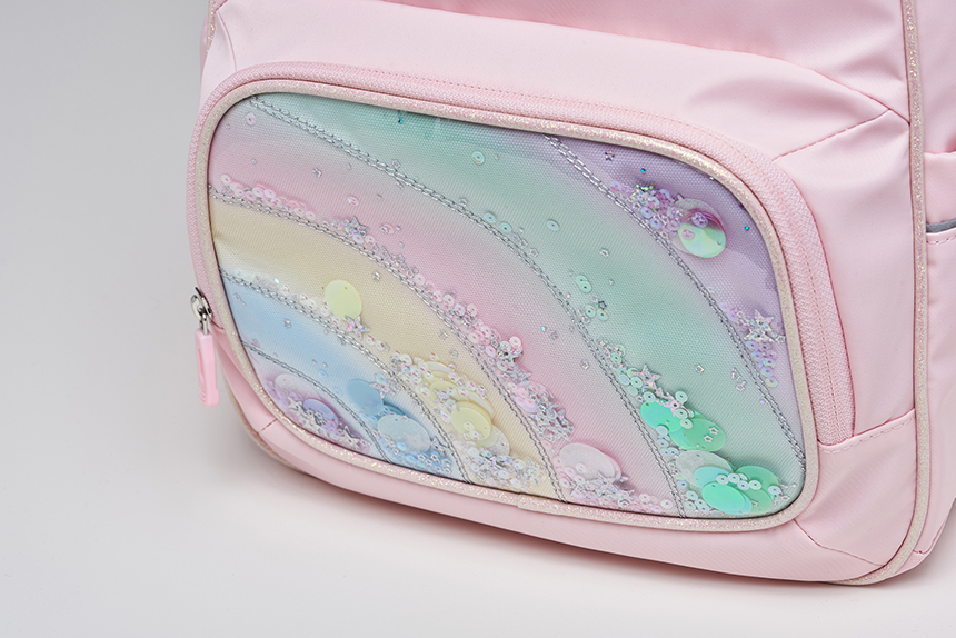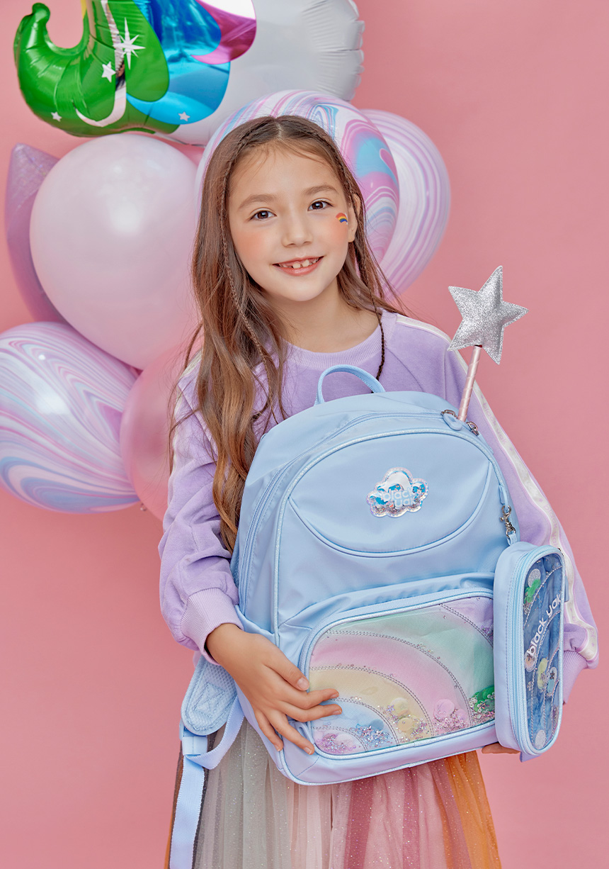 여아들의 호기심을 자극할 무지개 형상과 비즈 장식으로 포인트를 준 책가방 입니다.