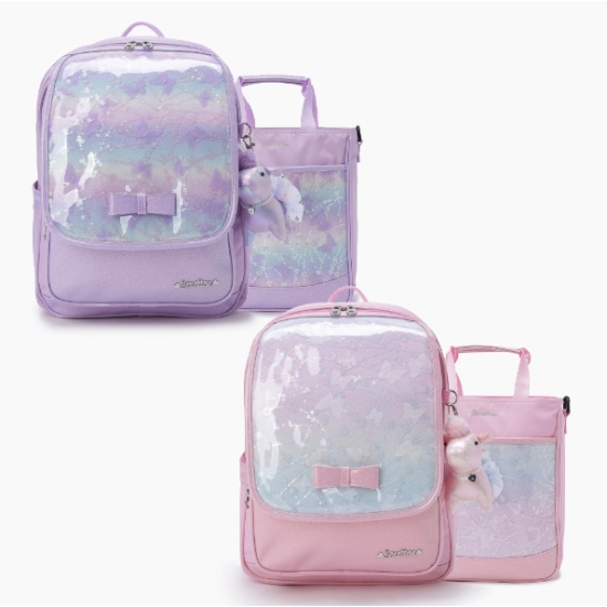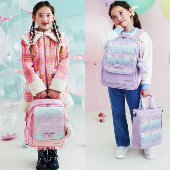 베네통 키즈만의 오로라 컬러감이 돋보이는 샤 스팽글 플랩 책가방.