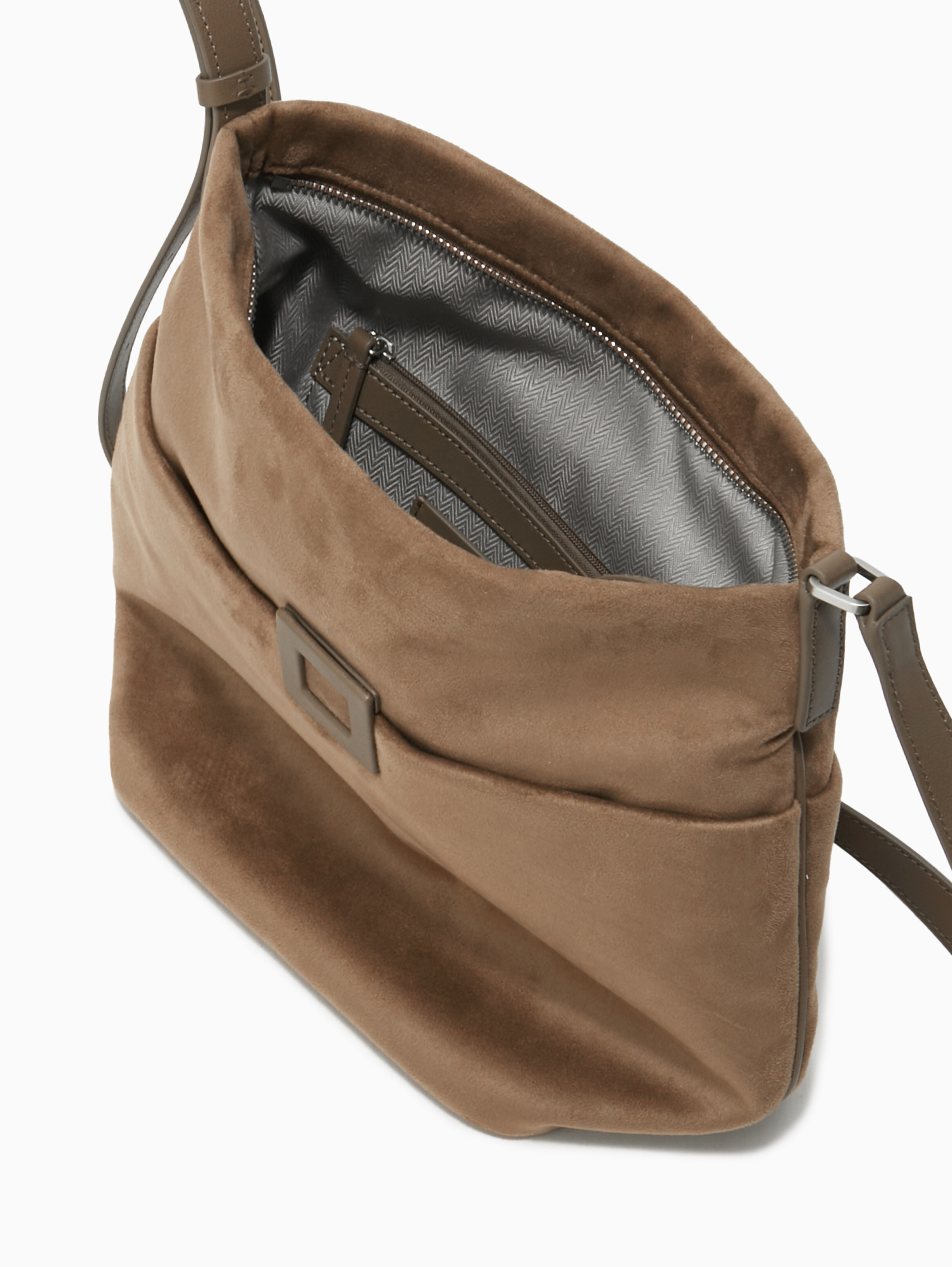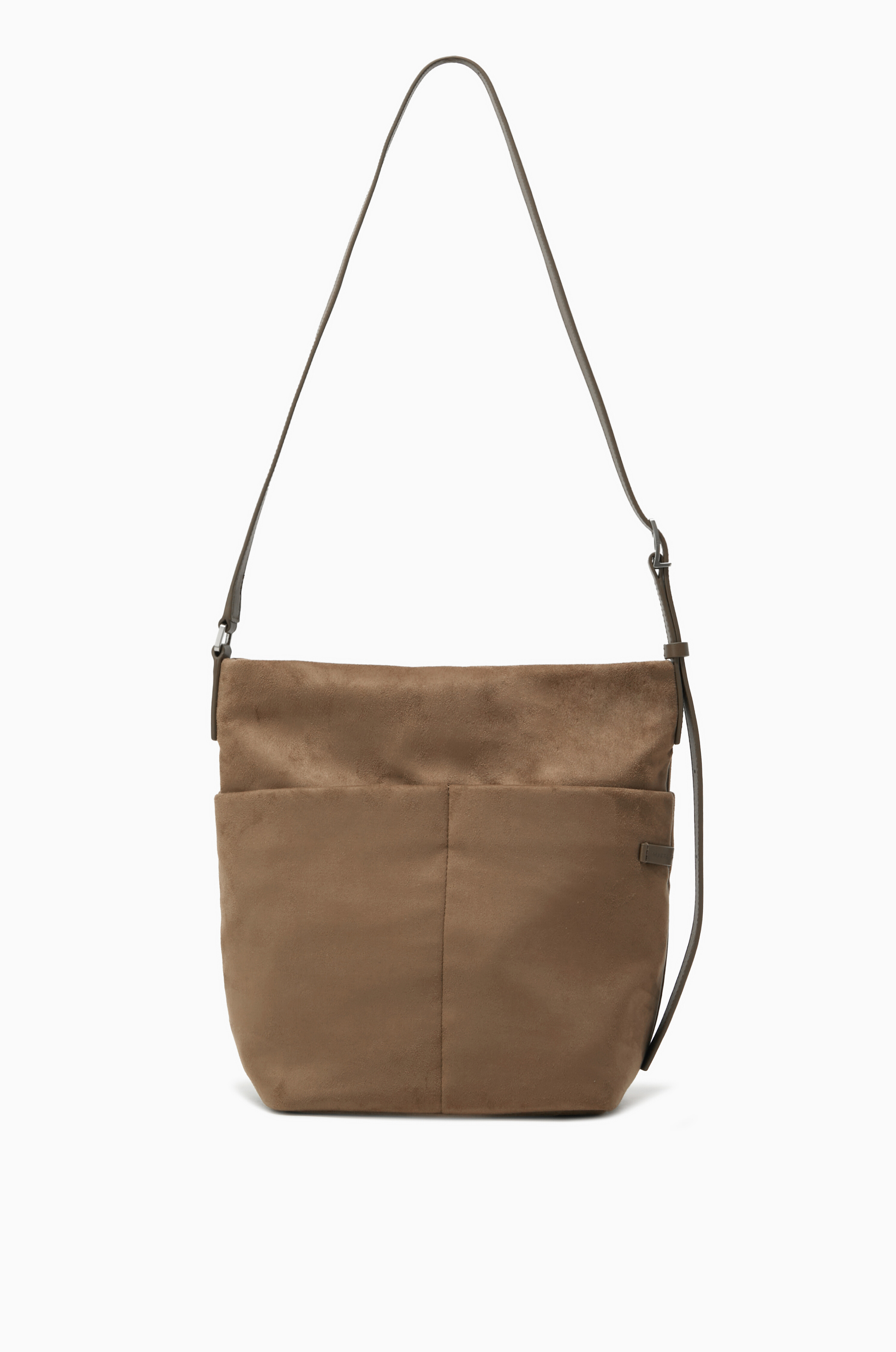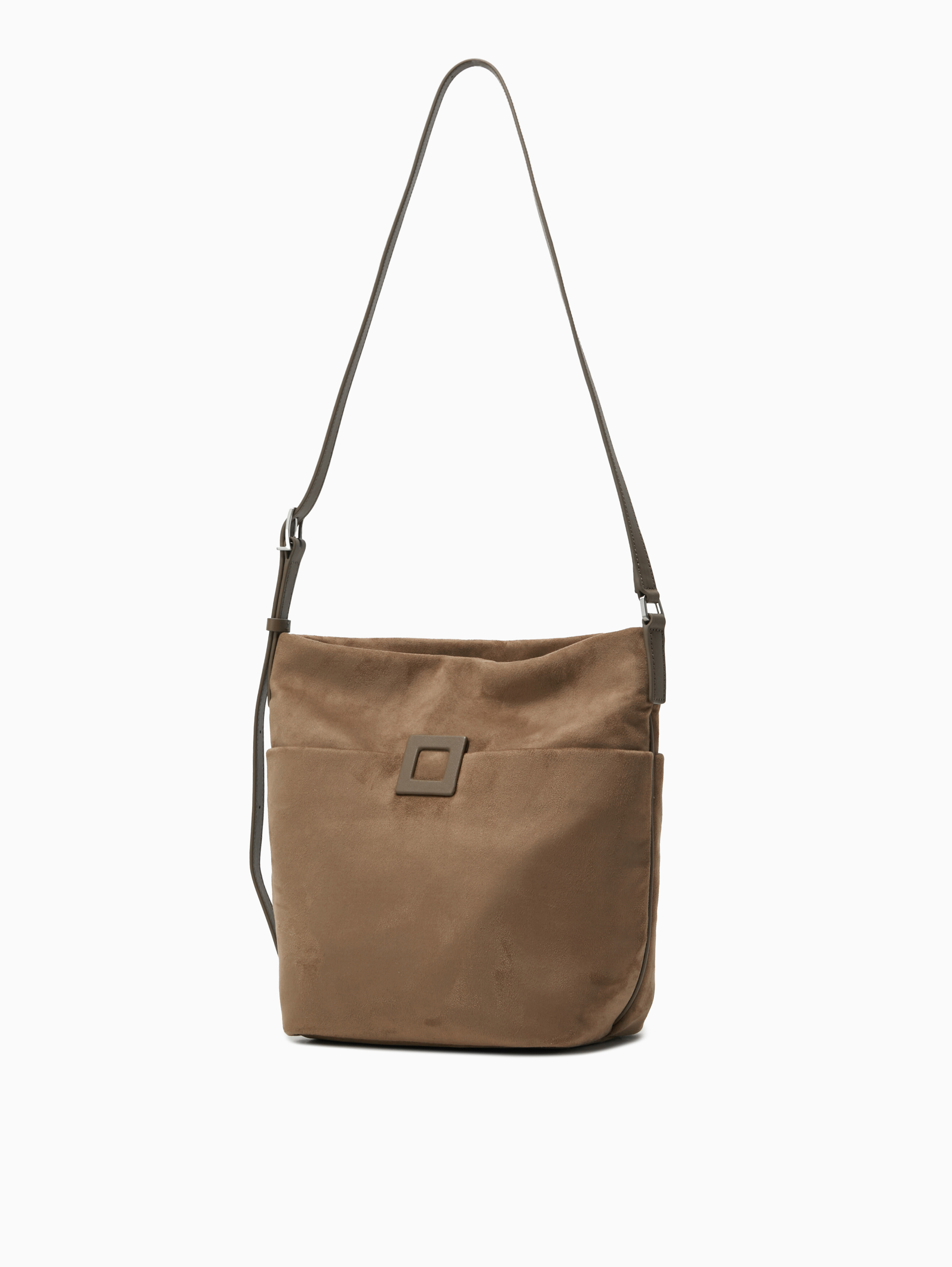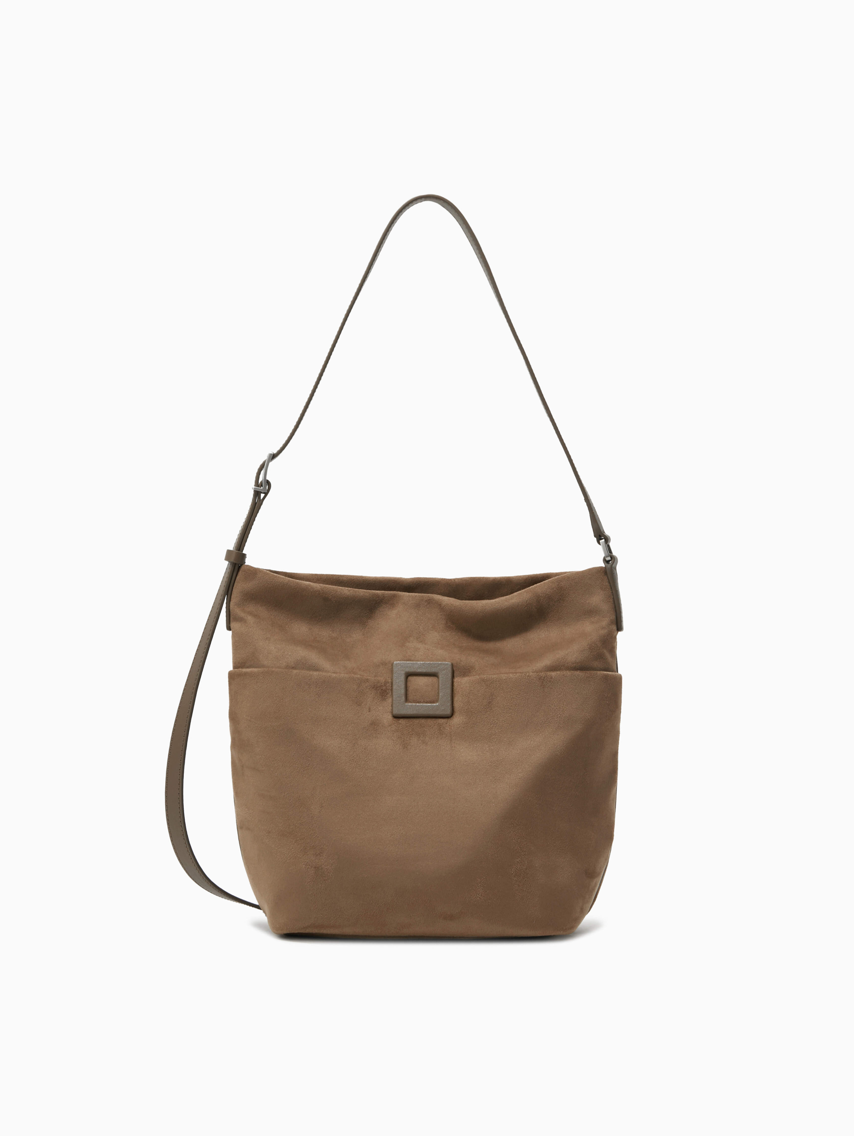 상단이 자연스럽게 쳐지는 형태가 멋스러운 버킷 백으로 중간 구멍에 연결하면 짧은 숄더로도 활용 가능한 데일리 스타일입니다.