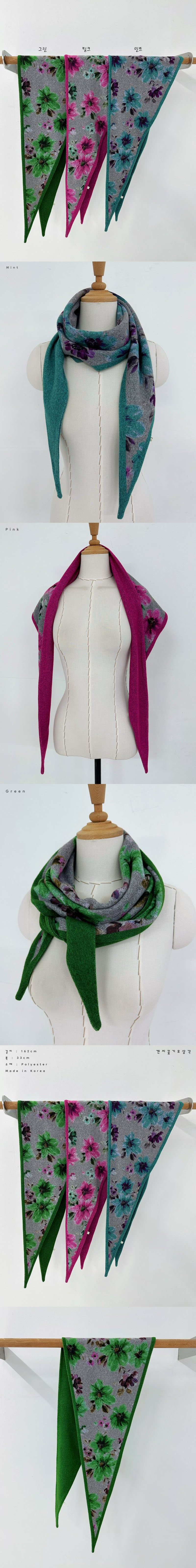 중년 여성 플라워 기모 삼각 여행 목도리색상 : 민트,핑크,그린사이즈 : 33 , 162cm소재 : 폴리