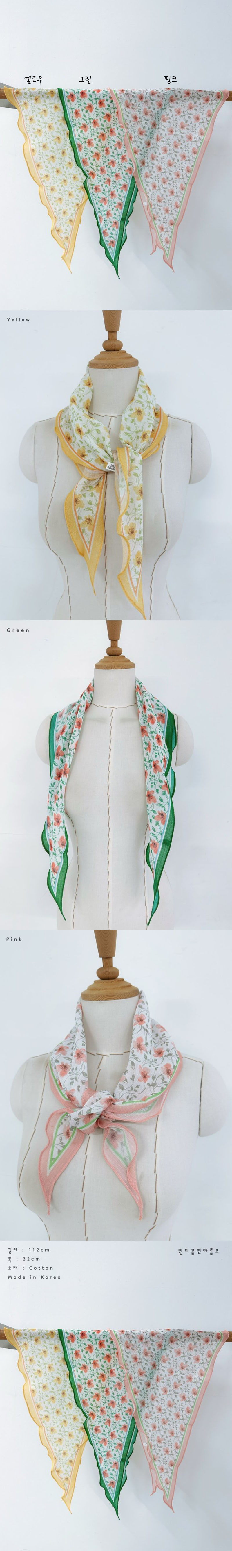 여성 플라워 면 미니 쁘띠 마름모 스카프색상 : 그린,핑크,옐로우사이즈 : 32 , 112cm소재 : 코튼